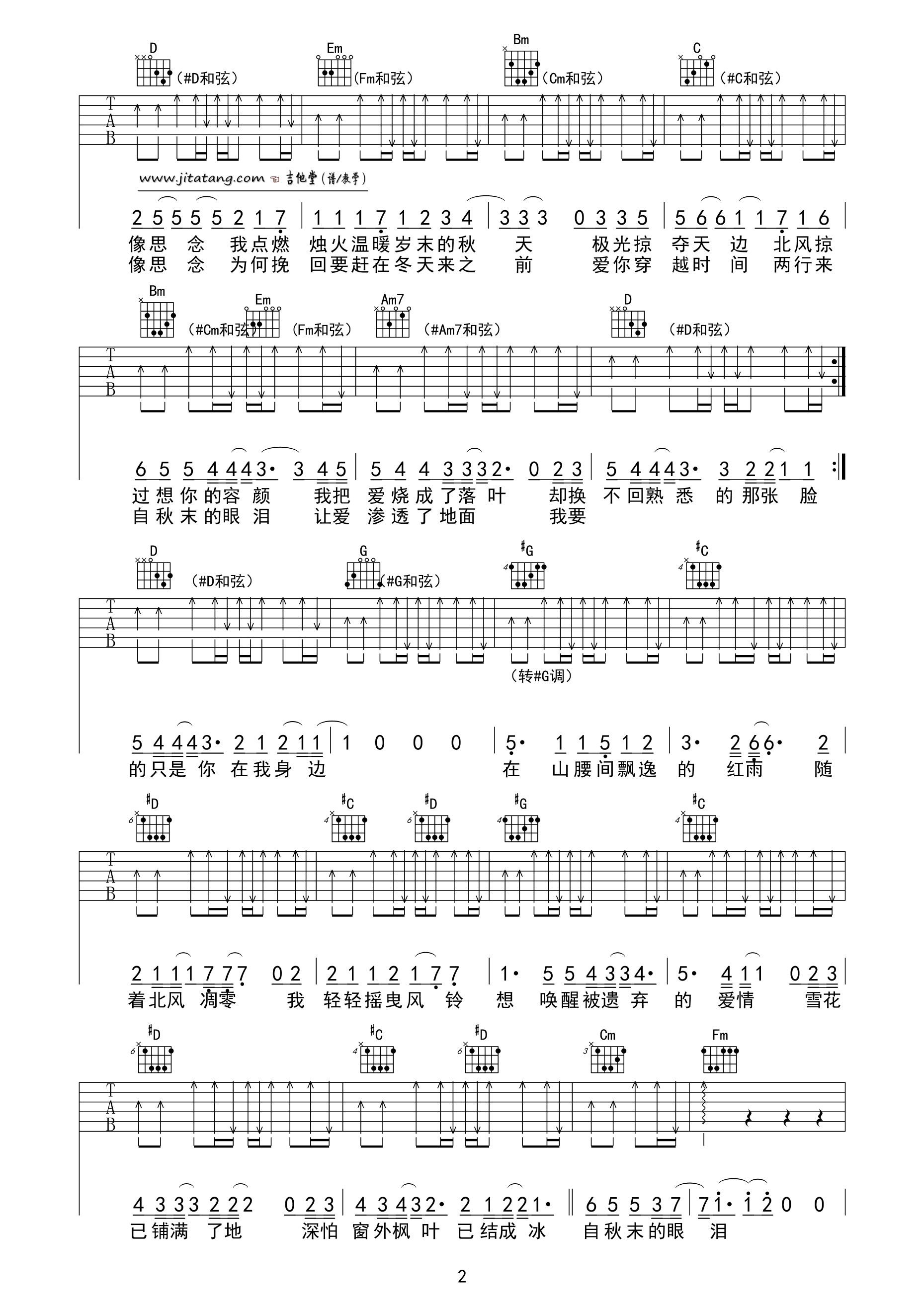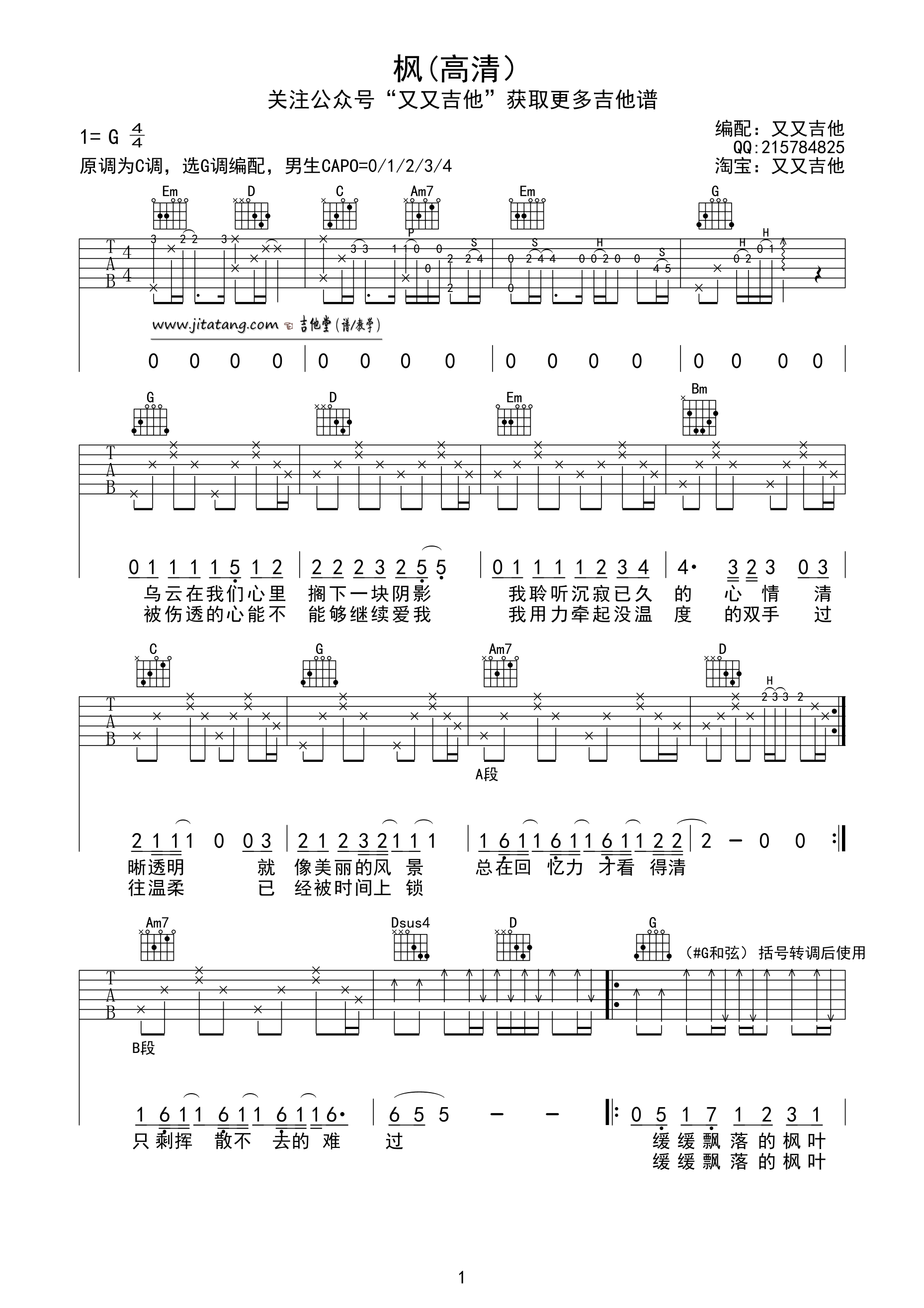 曲谱介绍: 周杰伦《枫》吉他弹唱谱,采用G调指法编配,又又吉他编配出品,共有3张高清图谱。