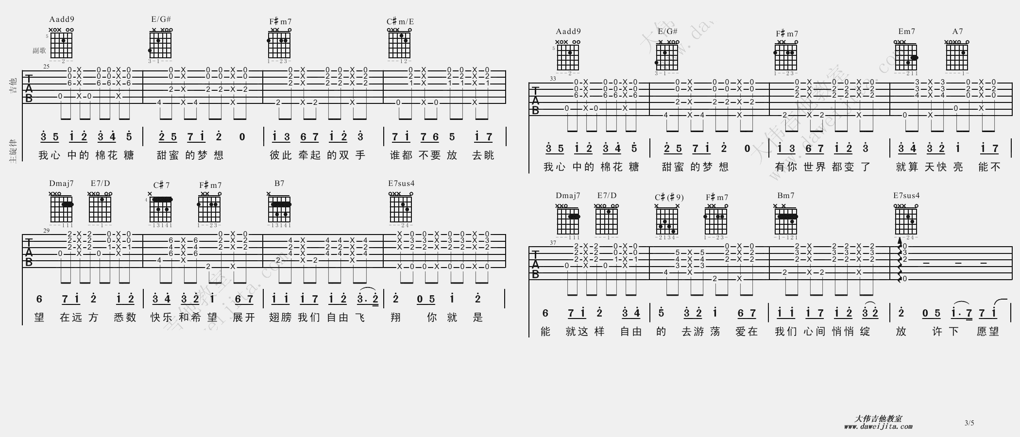 曲谱介绍: 至上励合《棉花糖》吉他弹唱谱,采用A调指法编配,大伟吉他教室编配出品,共有5张高清图谱。