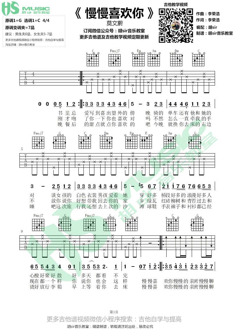 曲谱介绍: 莫文蔚《慢慢喜欢你》吉他弹唱谱,采用C调指法编配,胡sir吉他教室编配出品,共有2张高清图谱,免翻页排版设计。