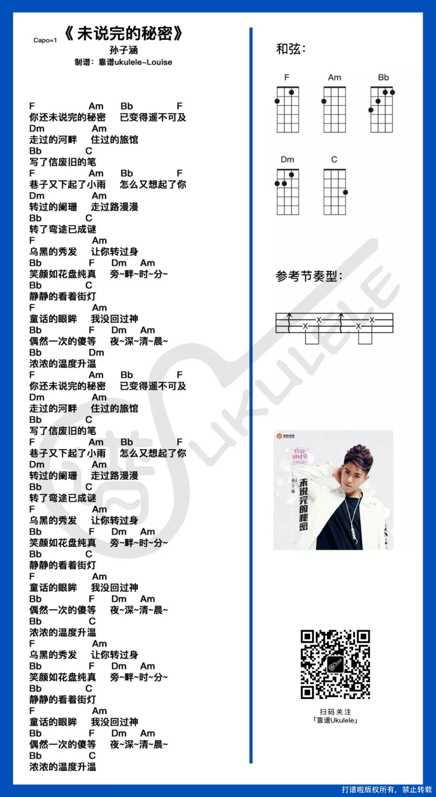 曲谱介绍: 孙子涵,对我来说又是一个陌生的歌手,90后非科班的一名唱作型歌手。太多歌手都不知道从哪开始去了解他们的音乐了(发曲谱仅仅是我的一种途径)。其实有不少好听的歌都是通过电影、电视剧被听到或者被加深印象的,也是因为这样有些比较低调的歌手,才被一部分人关注到吧。 因为后台留言,就去听了这首歌,可以听听看说不定是你喜欢的呢?孙子涵的音色还是不错的,算有辨识度?其实好像之前有知道一两首他的歌,算是歌火人不火的?歌词的部分很精简,可能是出于电视剧考虑吧(不太看网剧的人……科科)。 这首歌很容易哼唱,用到的和弦也只有5个,比较有的难度的就一个Bb和弦。还有人记得之前有提过如果没有办法好好按Bb可以怎么吗?这首歌可以用懒惰Bb,去掉1弦1品不按就可以,但是我是不会给你在谱中提示的,毕竟懒惰弹法不鼓励~还是应该按的准确才好。 变调夹1品!1品!1品!不然就等于降调咯~   「未说完的秘密」弹唱谱