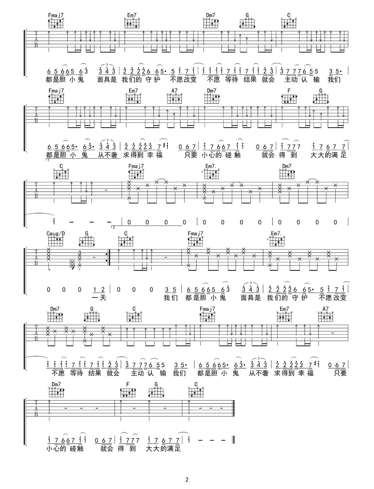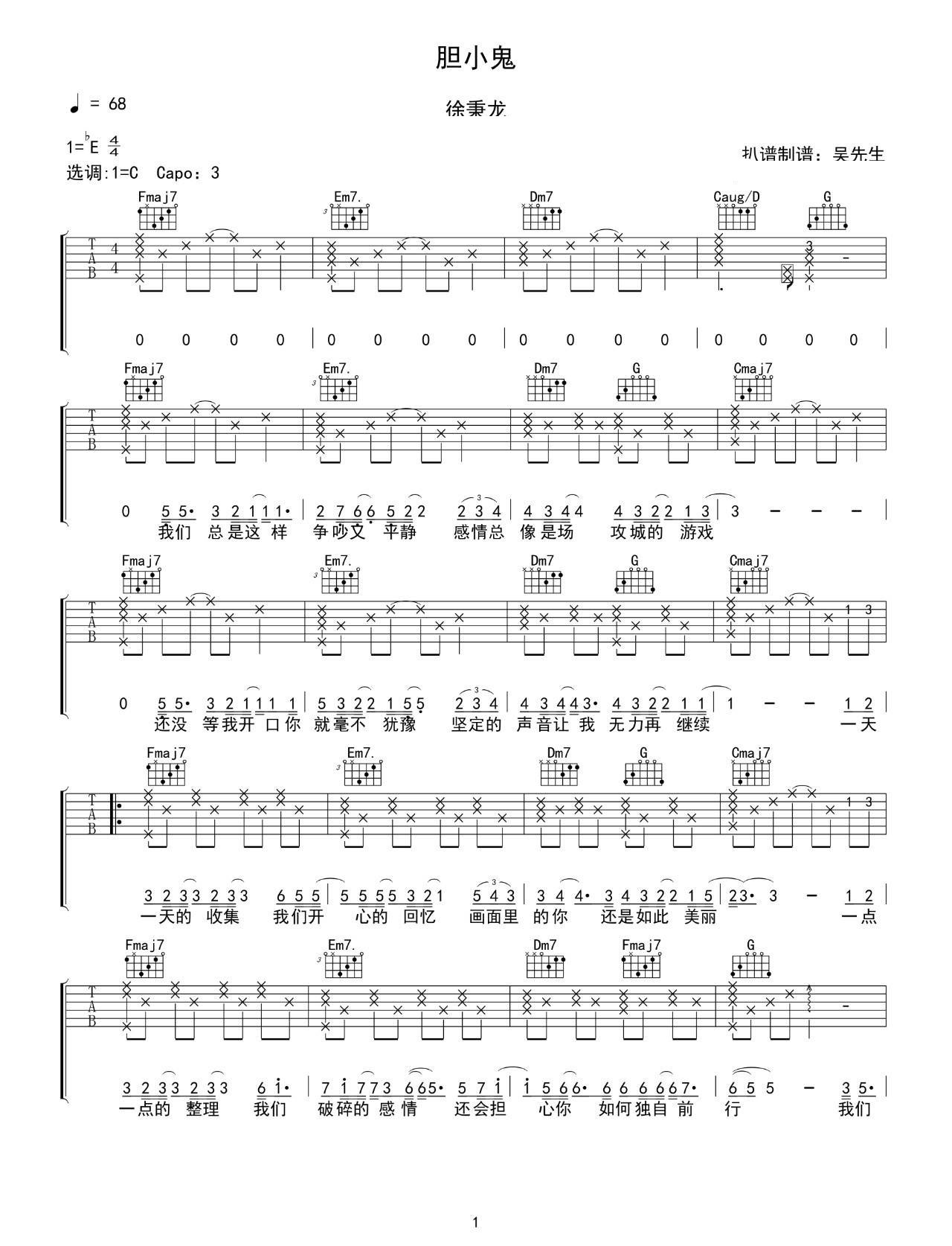 曲谱介绍: 徐秉龙《胆小鬼》吉他弹唱谱,采用C调指法编配,吴先生吉他编配出品,共有2张高清图谱,免翻页排版设计。