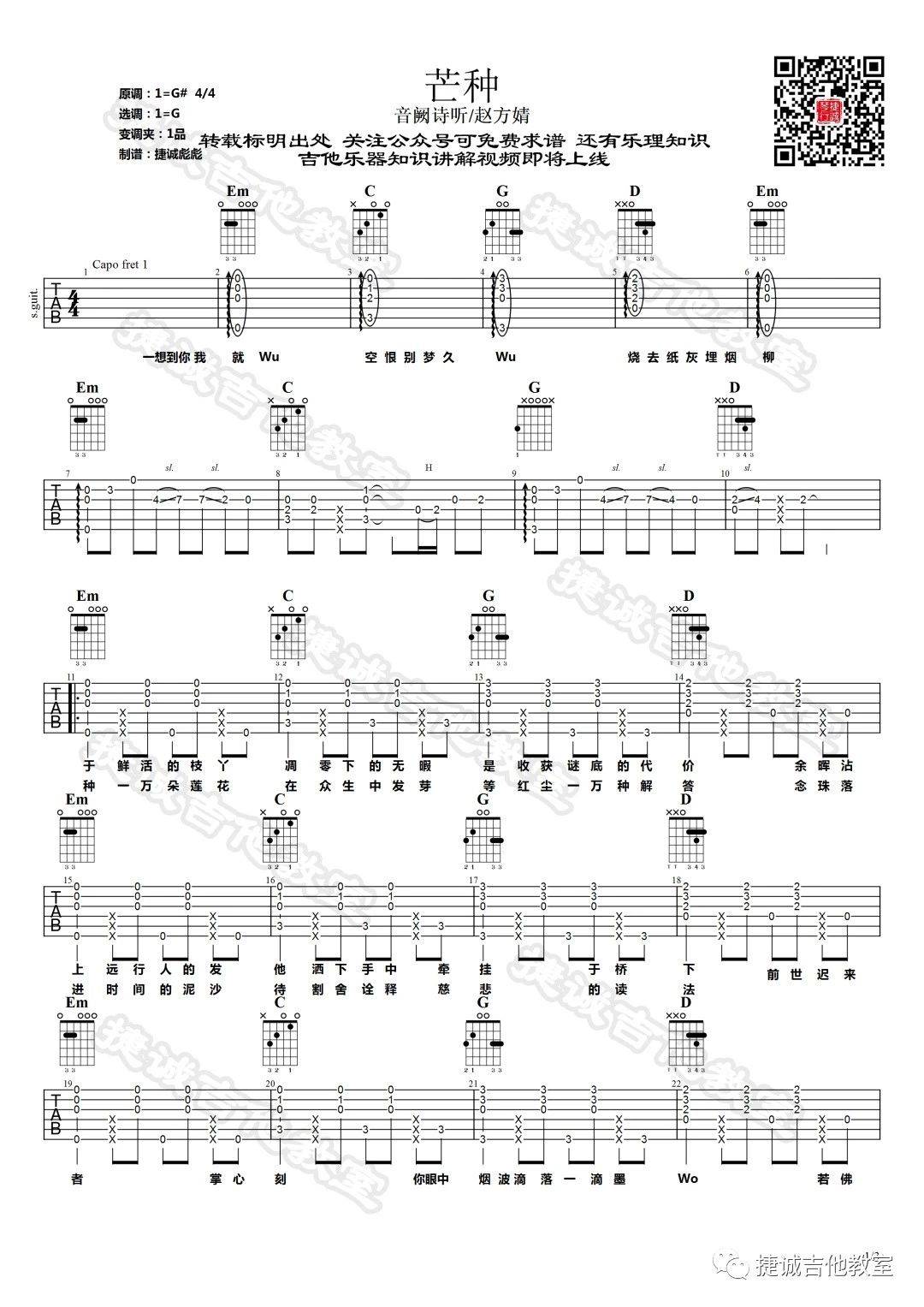 曲谱介绍: 音阙诗听《芒种》吉他弹唱谱,采用G调指法编配,鹤唳吉他教室编配出品,共有3张高清图谱。