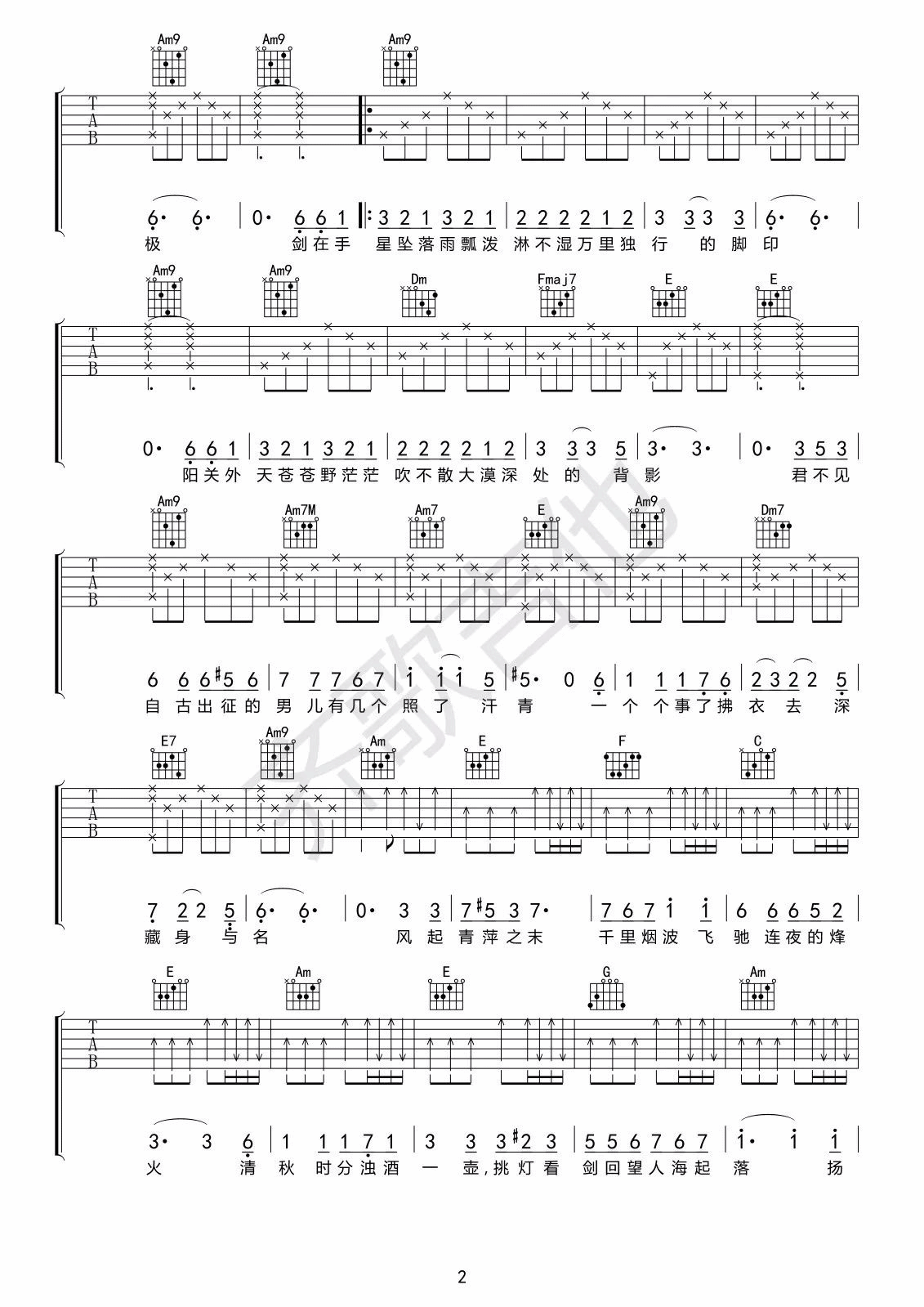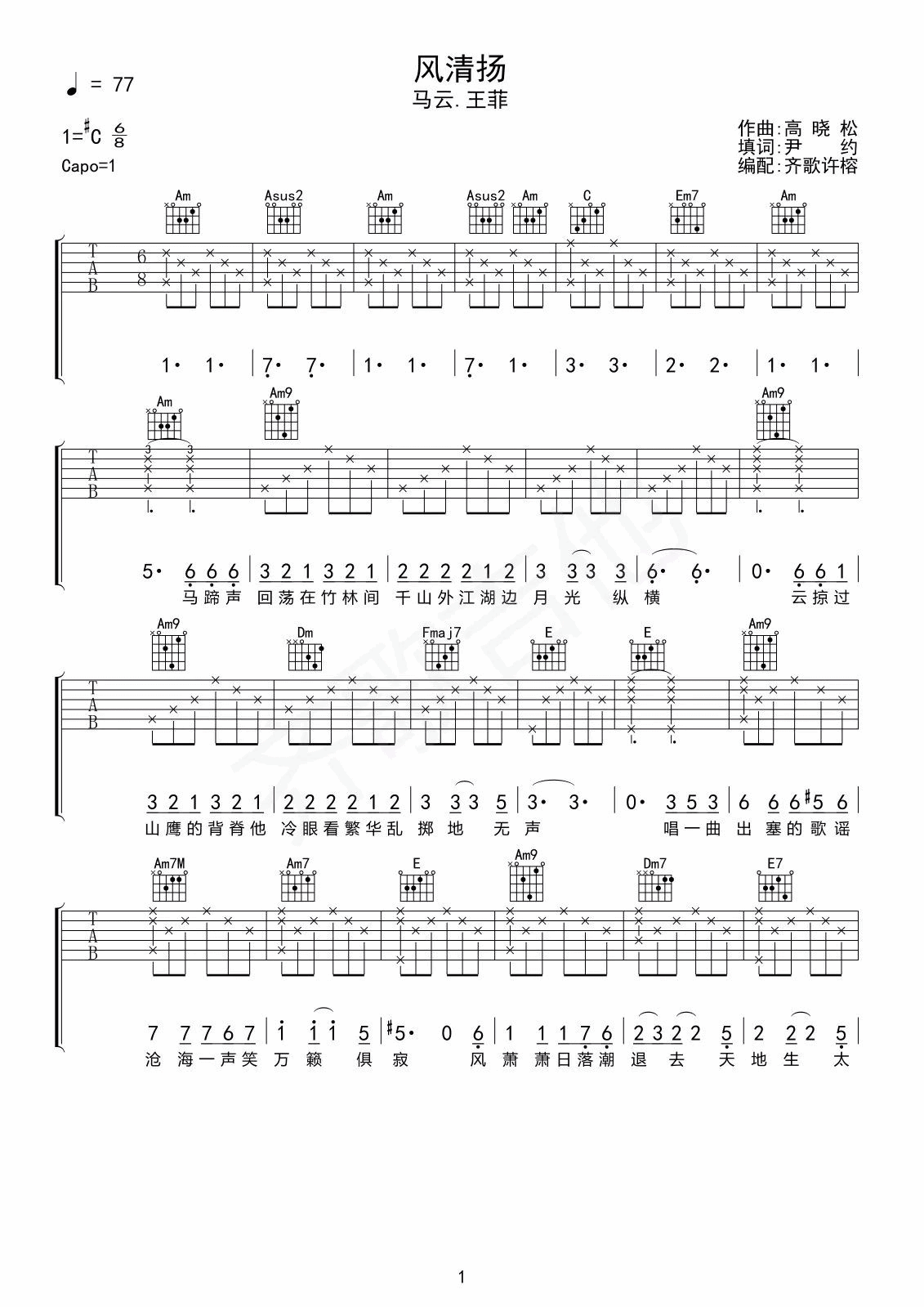 曲谱介绍: 王菲/马云《风清扬》吉他弹唱谱,采用C调指法编配,齐歌吉他编配出品,共有4张高清图谱。