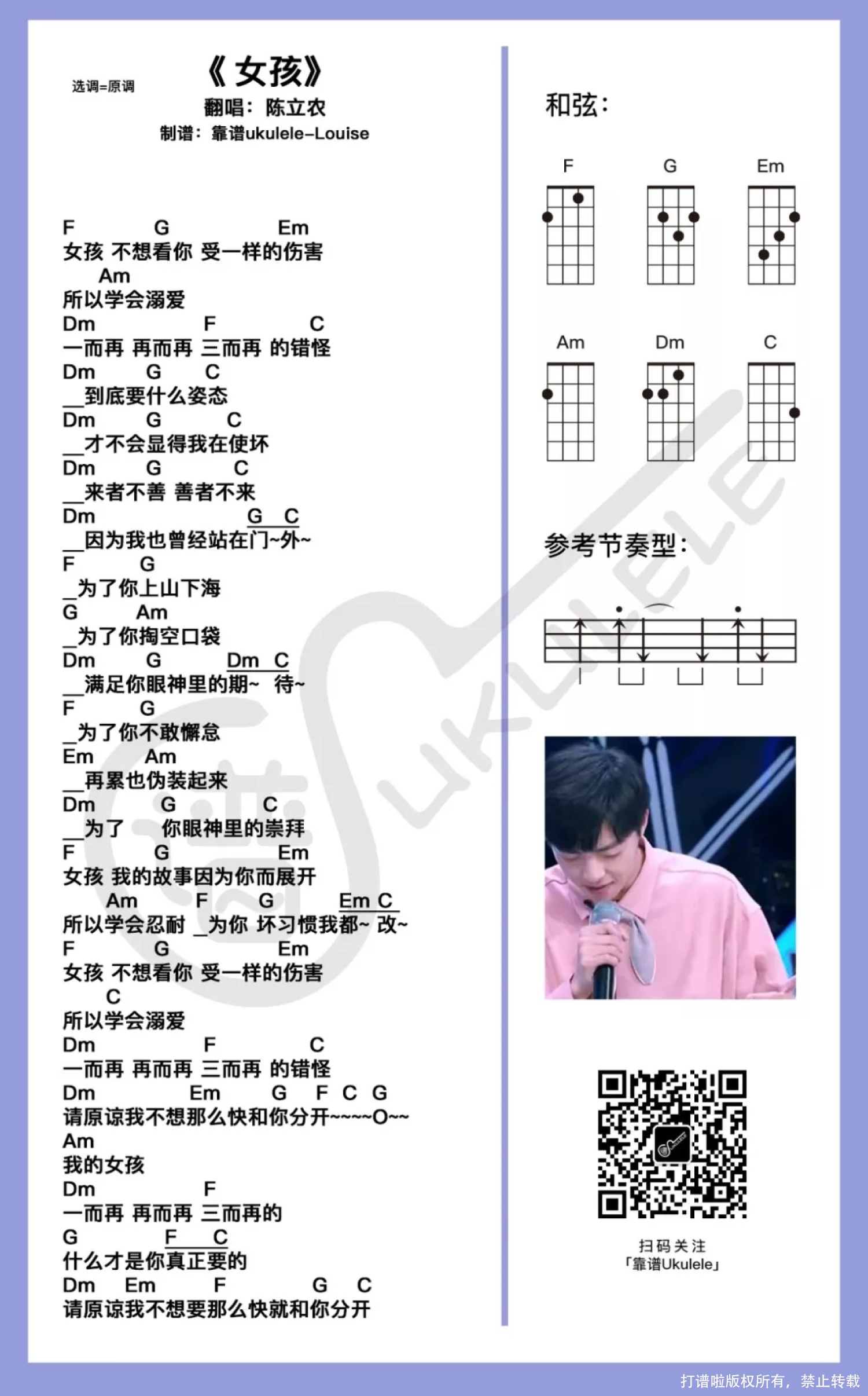农农(陈立农)版的『女孩』来咯~ 第四期的『偶像练习生』3个多小时……最新一期将近3个小时(首轮淘汰……看的揪心……梦想起步于梦,现实却骨干残酷,大家都太不容易了)。这是看过时间最长的综艺节目了,由于上次看节目的时候在准备「EiEi」的分享,最后我看节目看到了半夜……(也是醉了,对于一个作息极为老人的我……太难得了),连自己都觉得不可思议。 『偶像练习生』可能多多少少让我找回了以前的回忆,我们那时候的练功、排舞都算悠闲地,至少时间上充足没有竞争压力,不需要为了一个节目录制身心疲惫。 本期重点挺农农,真的真的觉得农农(陈立农)太软萌了,给人一种看他笑自己也想笑的感觉。这样的大男孩尽管练习生日常很心酸、严酷,还要能时不时保持暖心笑容。喜欢,这样的来一打哈哈哈。 看看张PD他们笑得多欢乐(除了张PD,吸引我一开始看节目的还有MCJin、Jackson都是超喜欢的)。 陈立农首秀表演真的感觉不错(一直在进步,「大艺术家」的性感还是弱了一些些,这个年纪耍酷应该也不错吧,逼死人系列潜力股哈哈),相比其他团体、个人,有一种小清新,有一种甜甜的味道~粉嫩糖果系+满分笑容,让他在最初的百人群体中亮了~ 首秀的农农很有综艺感,为了F不向自己招手,特地去摇D的萌…… 那句“因为在我的认知里面老师有Cue就可以跳,没有Cue就不能跳”,Cue一个就跳一个的可爱与实在。 还有第一次首秀一心拿D,却得到A时候的那种小激动。 最新一期排位宣布的结果,蔡徐坤第一(他很赞,实力本来就很强,没话说),陈立农排第二(努力付出就是会被看到的)。 「女孩」弹唱谱 其实……写这次分享内容的时候才反应过来……错过了『偶像练习生』星期五的播出(放一个春节假期,都忘记了星期几了,忙着做谱呵呵……)。回头看在练习生抢福利的那段中,农农抢礼物的时候帅呆的啦,爆发力就是这么强,可爱大男孩加油加油!一些虽然没有抢到,但是同样拼的,更多收获到了兄弟的支持,好喜欢这群有爱的大男孩们,他们真的都很棒!希望留下的60个练习生都能加油!!!真希望他们能一直停留在一起吃海底捞的时刻,开心,兴奋,快乐。 最后最后最后!!!(虽然知道不会有很多人看到,就是想说)请那些拿着所谓“料”的人理智一点吧,我从来不追星,也没有多专注的粉过什么人,但是看不下去你们这样伤害挥洒汗水努力拼搏的孩子。我就是单纯喜欢农农、喜欢蔡徐坤、小鬼……还有很多,这并不矛盾啊!为什么参加节目被关注就要被攻击? 上节目受欢迎怎么了?籍贯台湾怎么了?贝汯璘、Jeffrey、林彦俊、邱治谐、许凯皓都是籍贯台湾。难道你们觉得台湾不是我们祖国的一部分?(别拿所谓的“爱国”来丢人!!!) 你们没有感情?有点名气连生活都要被指指点点?不能有自己的生活?连朋友都不能有异性?别逗了,你们身边一个异性都没有?有一个就是关系亲密?那要是多几个,岂不就是脚踩N船?就不能让他们脸上多一点笑容?承认他们很棒,很努力就这么难?你们到底知道练习生多少?反正我不会否定他们任何人,说破了大家都是舆论的一个棋子而已。 请单纯一点的喜欢、支持吧,别拿你们的“爱”当借口去伤害不了解的人!因为你们谁都不了解。你们追的人也都是普通人,只是他们的职业比较特殊而已。别让他们为你们的行为买单。 节目常说的一句话“越努力越幸运”,他们值得拥有认可与支持!不管最终留下哪9个,都希望他们未来发展能稳定。