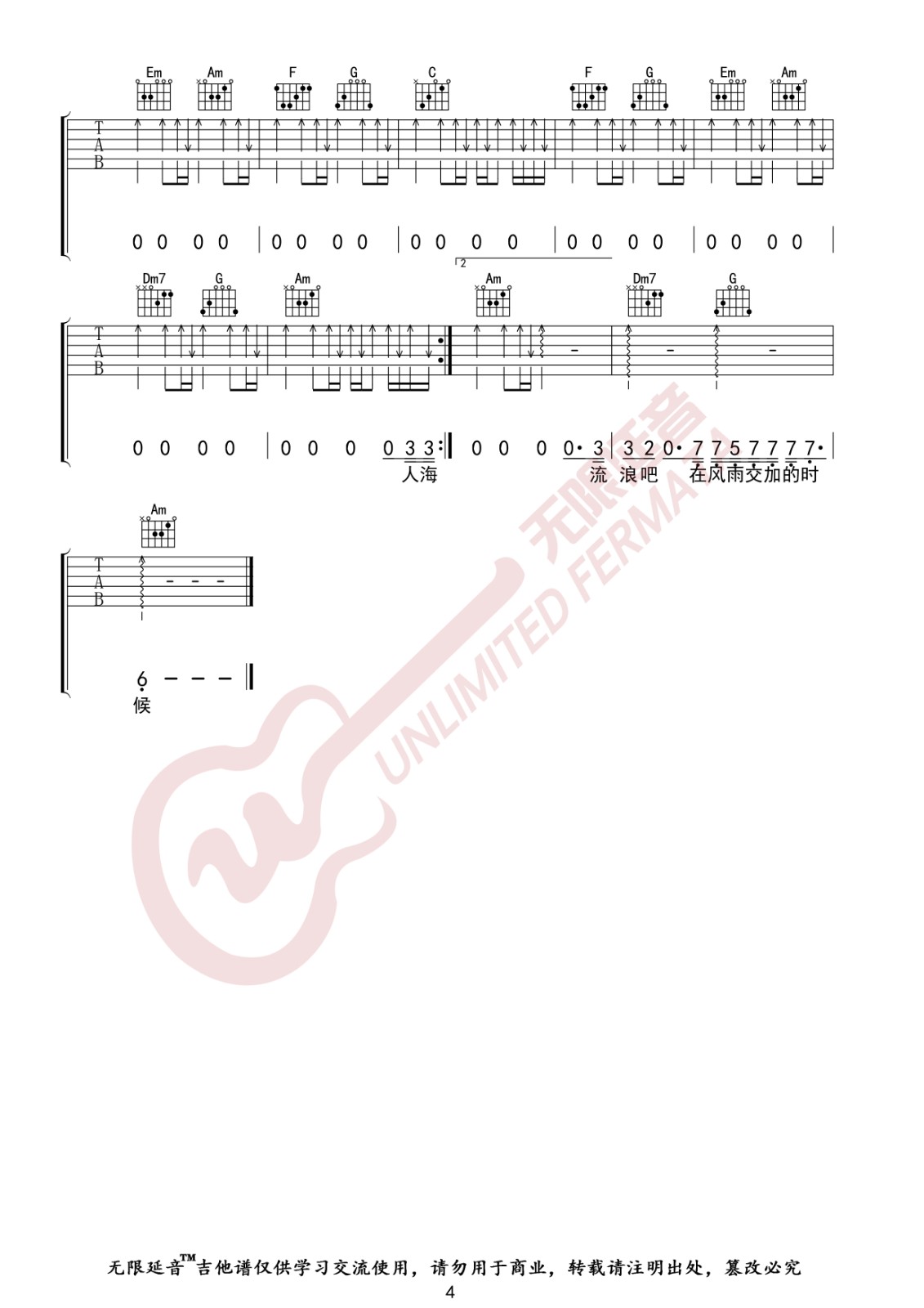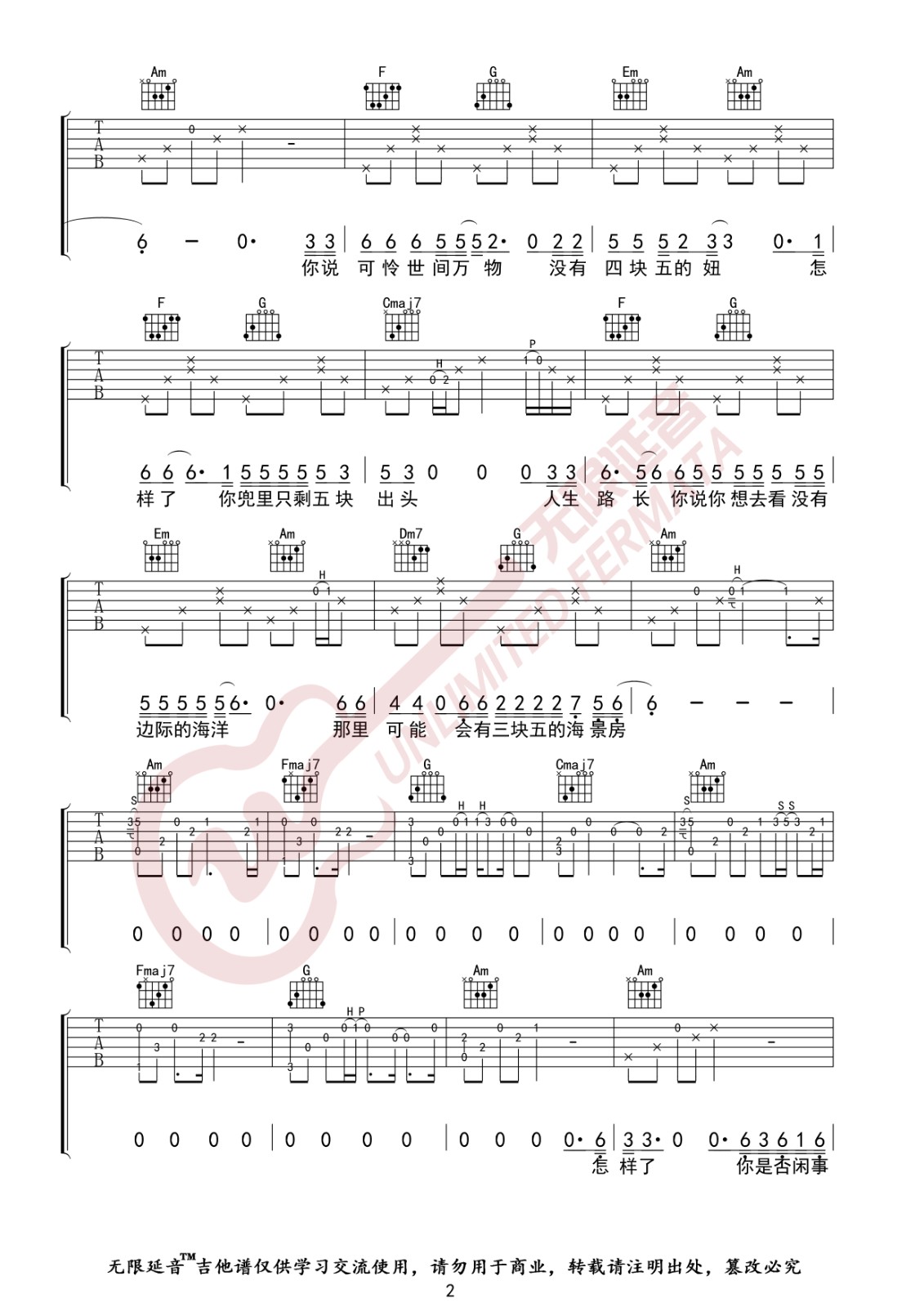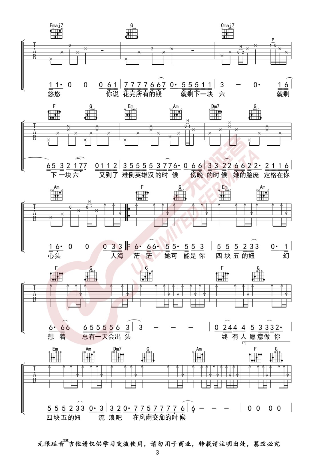 曲谱介绍: 隔壁老樊《四块五》吉他弹唱谱,采用C调指法编配,无限延音编配出品,共有4张高清图谱。