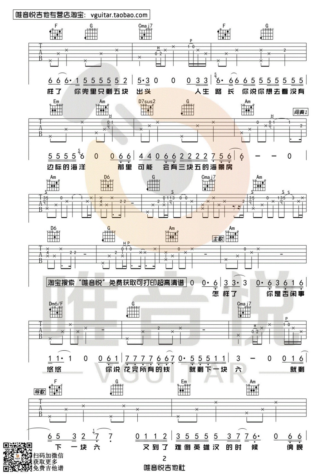 曲谱介绍: 隔壁老樊《四块五》吉他弹唱谱,采用C调指法编配,唯音悦编配出品,共有3张高清图谱。
