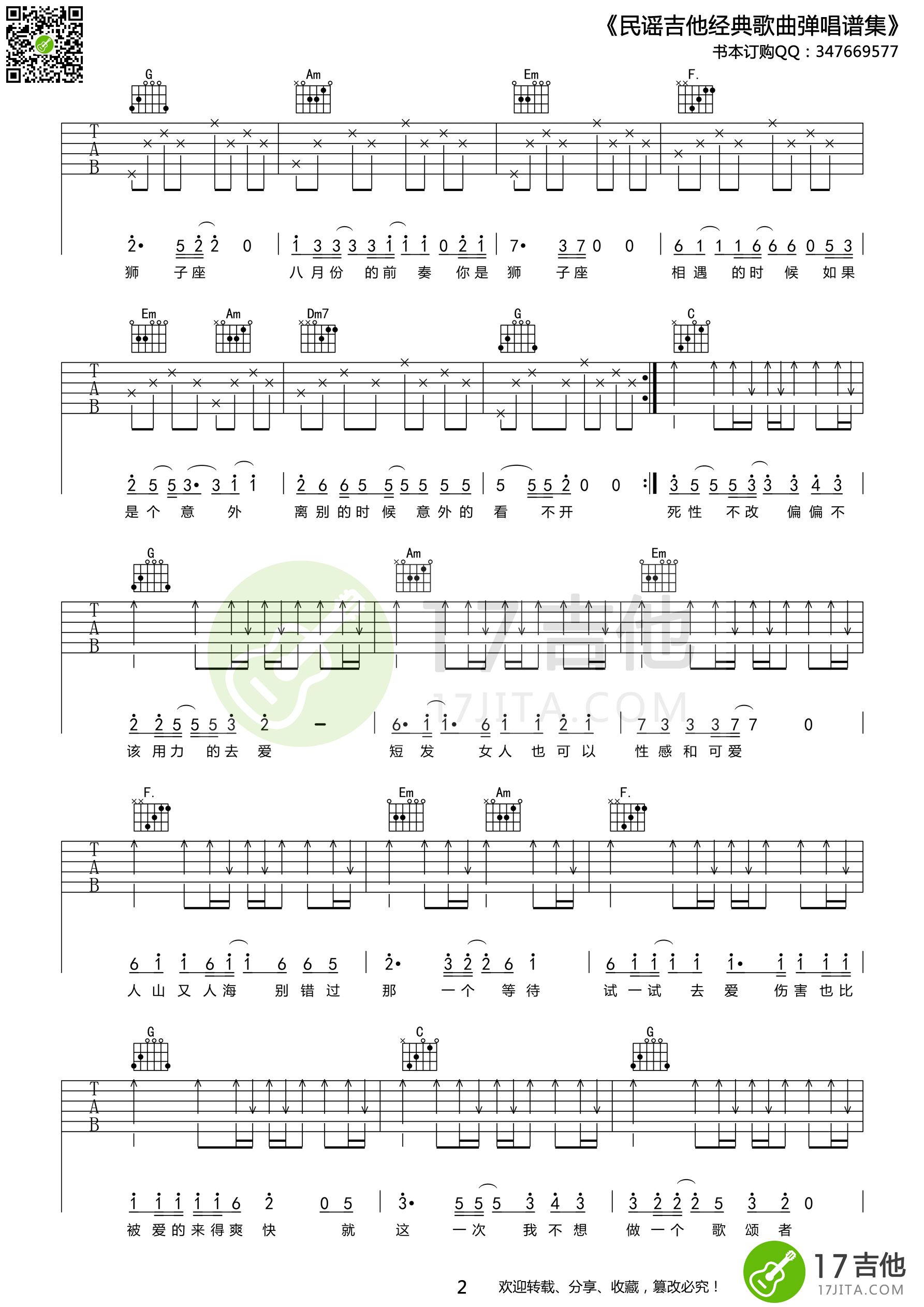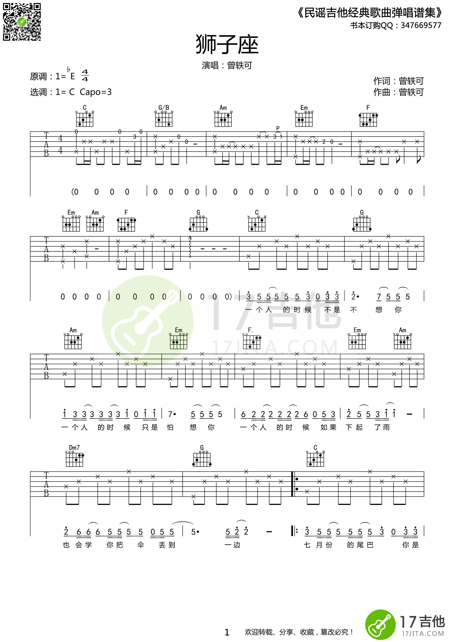 曲谱介绍: 曾轶可《狮子座》吉他弹唱谱,采用C调指法编配,17吉他编配出品,共有3张高清图谱。