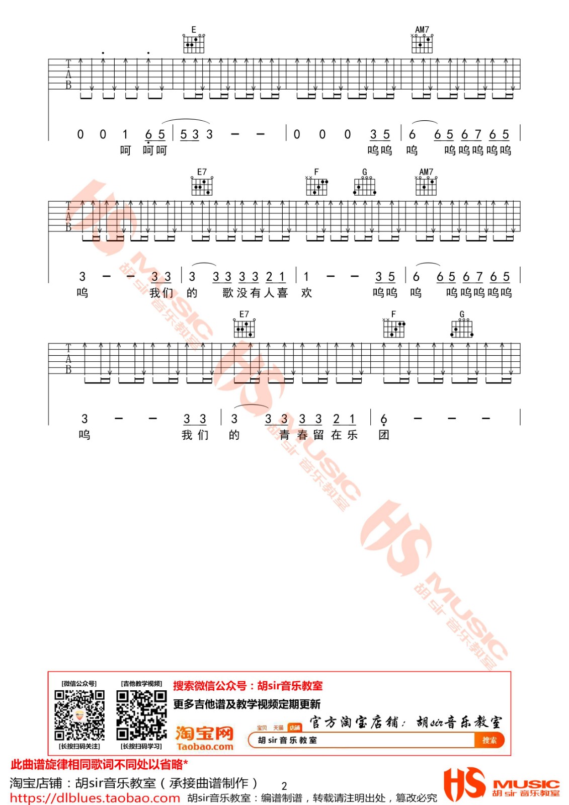 曲谱介绍: 李荣浩《乐团》吉他弹唱谱,采用C调指法编配,胡sir吉他教室编配出品,共有2张高清图谱,免翻页排版设计。