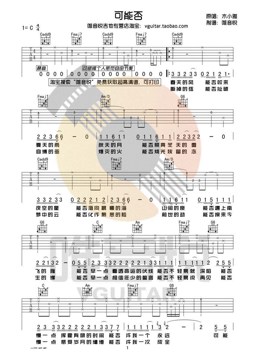 曲谱介绍: 木小雅《可能否》吉他弹唱谱,采用C调指法编配,唯音悦编配出品,共有2张高清图谱,免翻页排版设计。