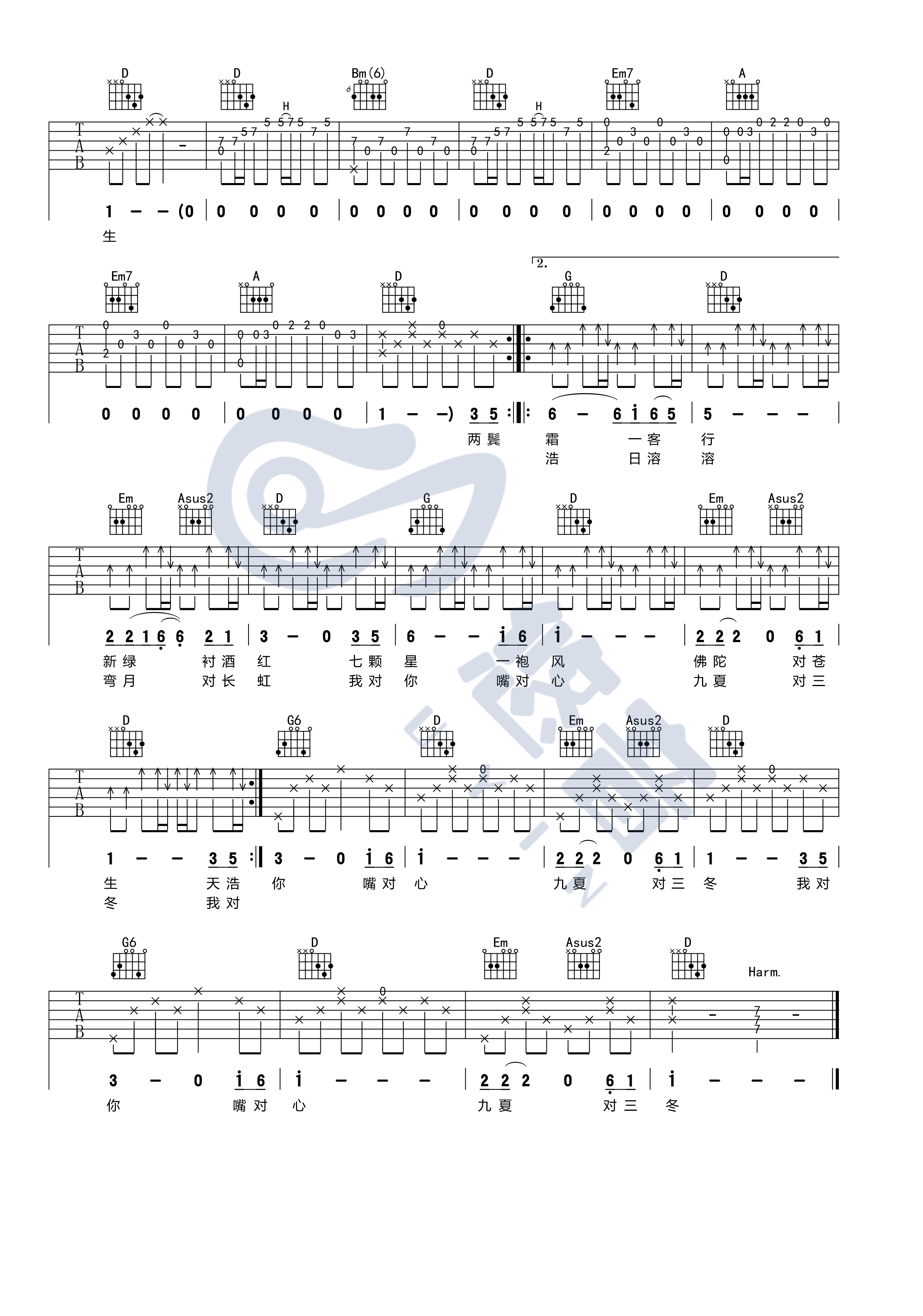 曲谱介绍: 赵照《声律启蒙》吉他弹唱谱,采用D调指法编配,悠音课堂编配出品,共有2张高清图谱,免翻页排版设计。