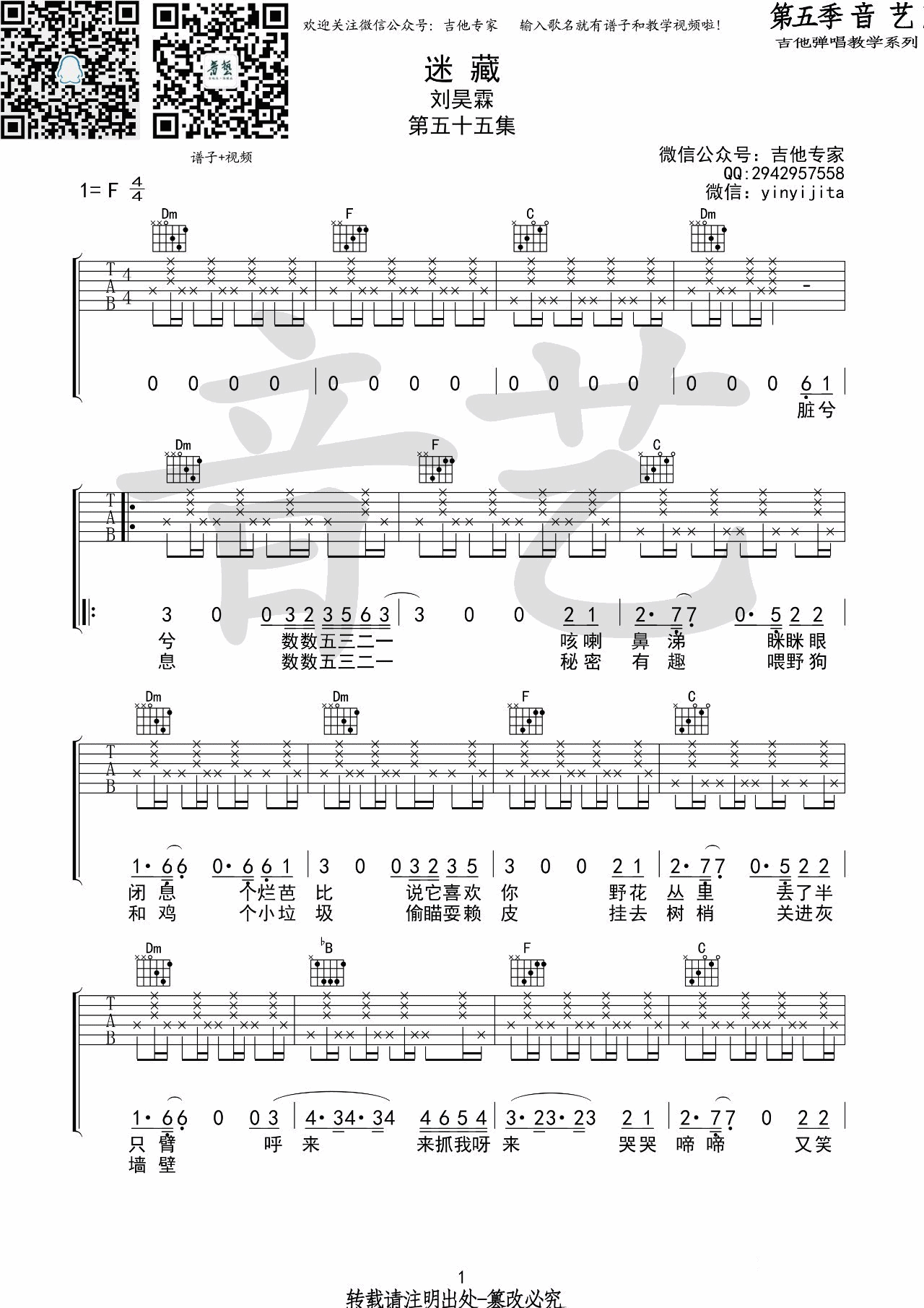 曲谱介绍: 刘昊霖《迷藏》吉他弹唱谱,采用F调指法编配,音艺吉他编配出品,共有2张高清图谱,免翻页排版设计。