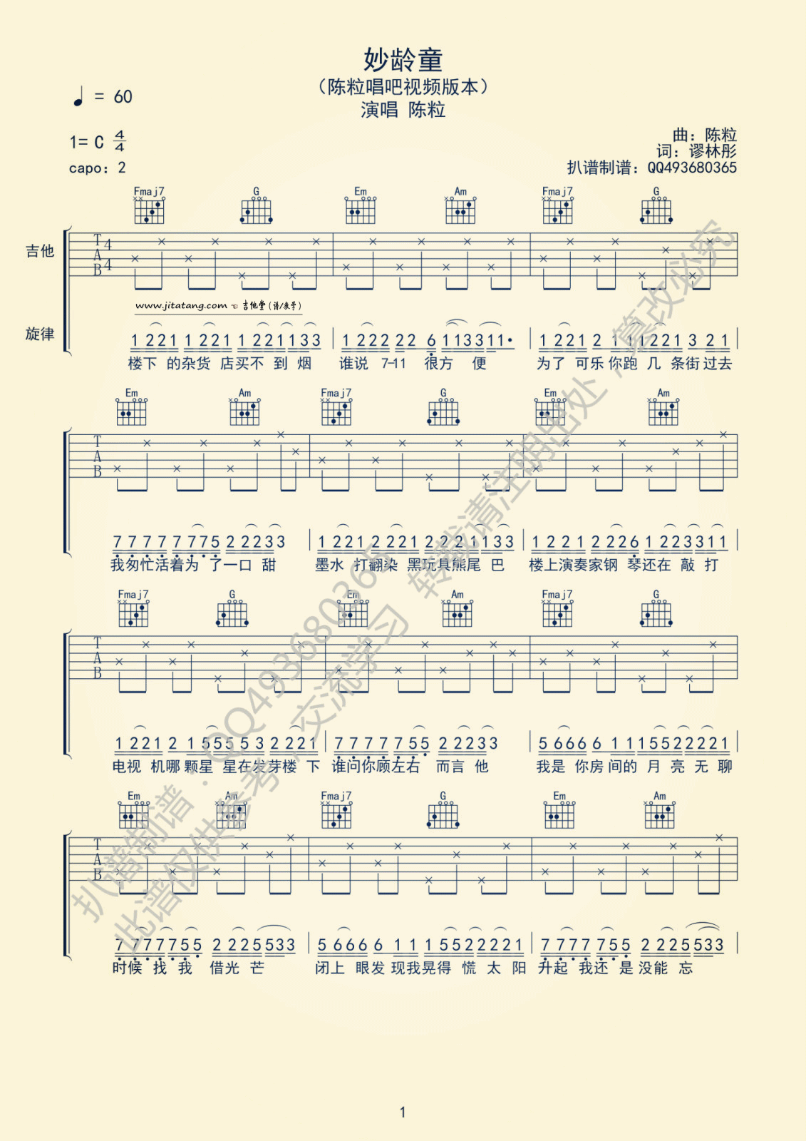 曲谱介绍: 陈粒《妙龄童》吉他弹唱谱,采用C调指法编配,共有3张高清图谱。