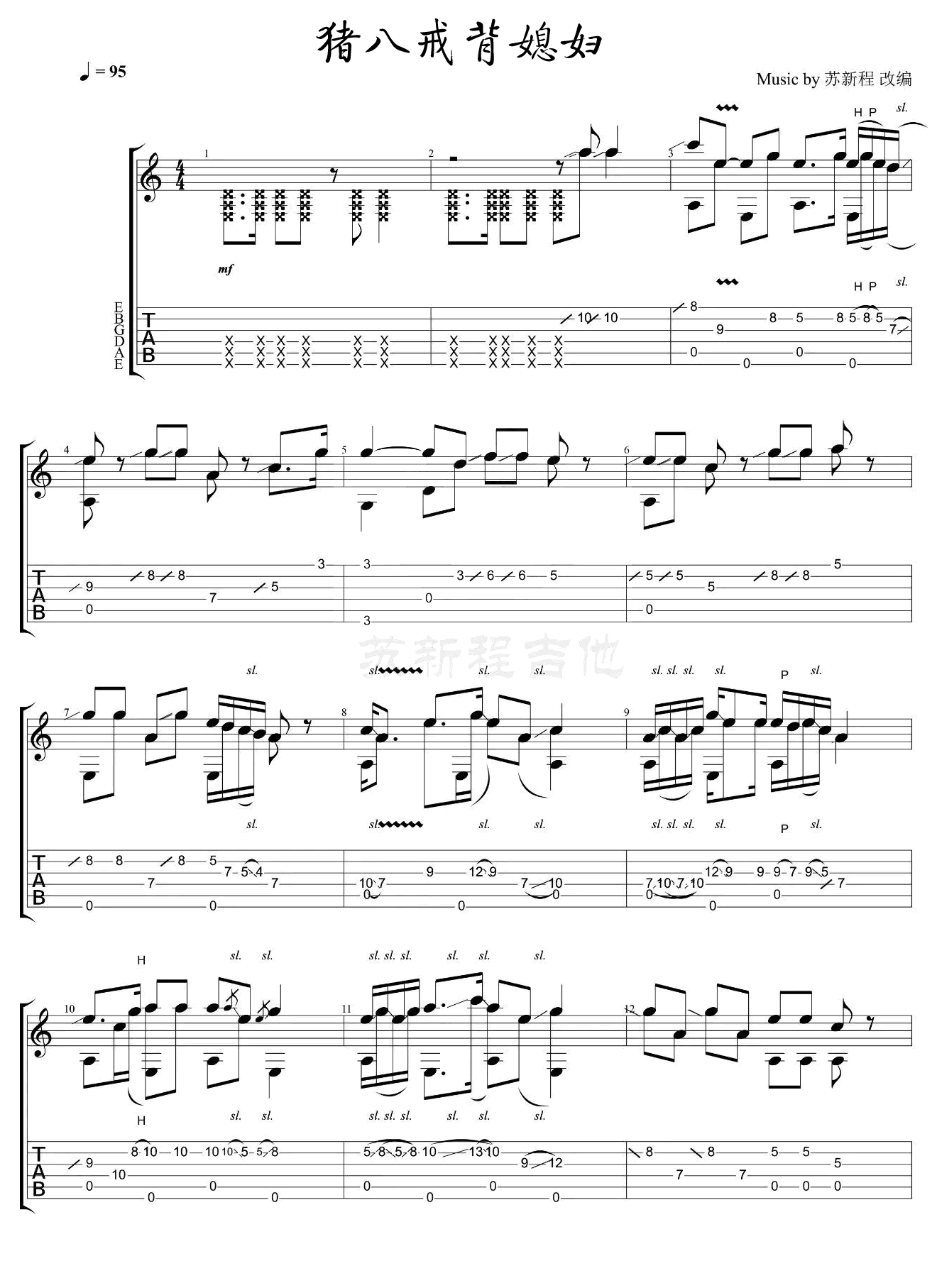 曲谱介绍: 感谢苏新程老师带来曲谱配套的《猪八戒背媳妇》演示和教学视频,希望提升指弹功力的琴友们不要错过,参照示范讲解练习起来吧。