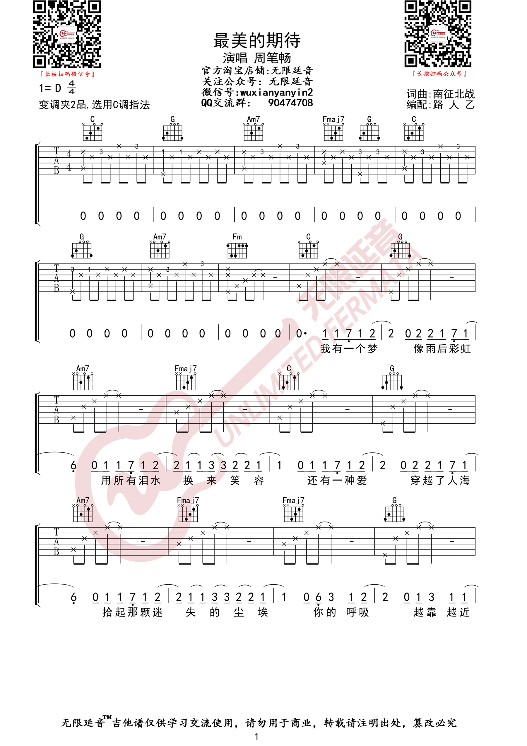 曲谱介绍: 《最美的期待》吉他谱_周笔畅_C调简单版弹唱谱_高清六线谱分享,《最美的期待》周笔畅演唱的歌曲,亦是电视剧《茧镇奇缘》的片头曲,由南征北战NZBZ创作词曲,“梦为努力浇了水,爱在背后往前推”大概就是我对周笔畅演唱的《最美的期待》的感觉吧。努力的泪水始终会换来笑容,你的爱就是我所有的追求。因为一个想靠近你的的梦,努力的想法才恣意生长,你坚持的爱是我持续努力的理由。