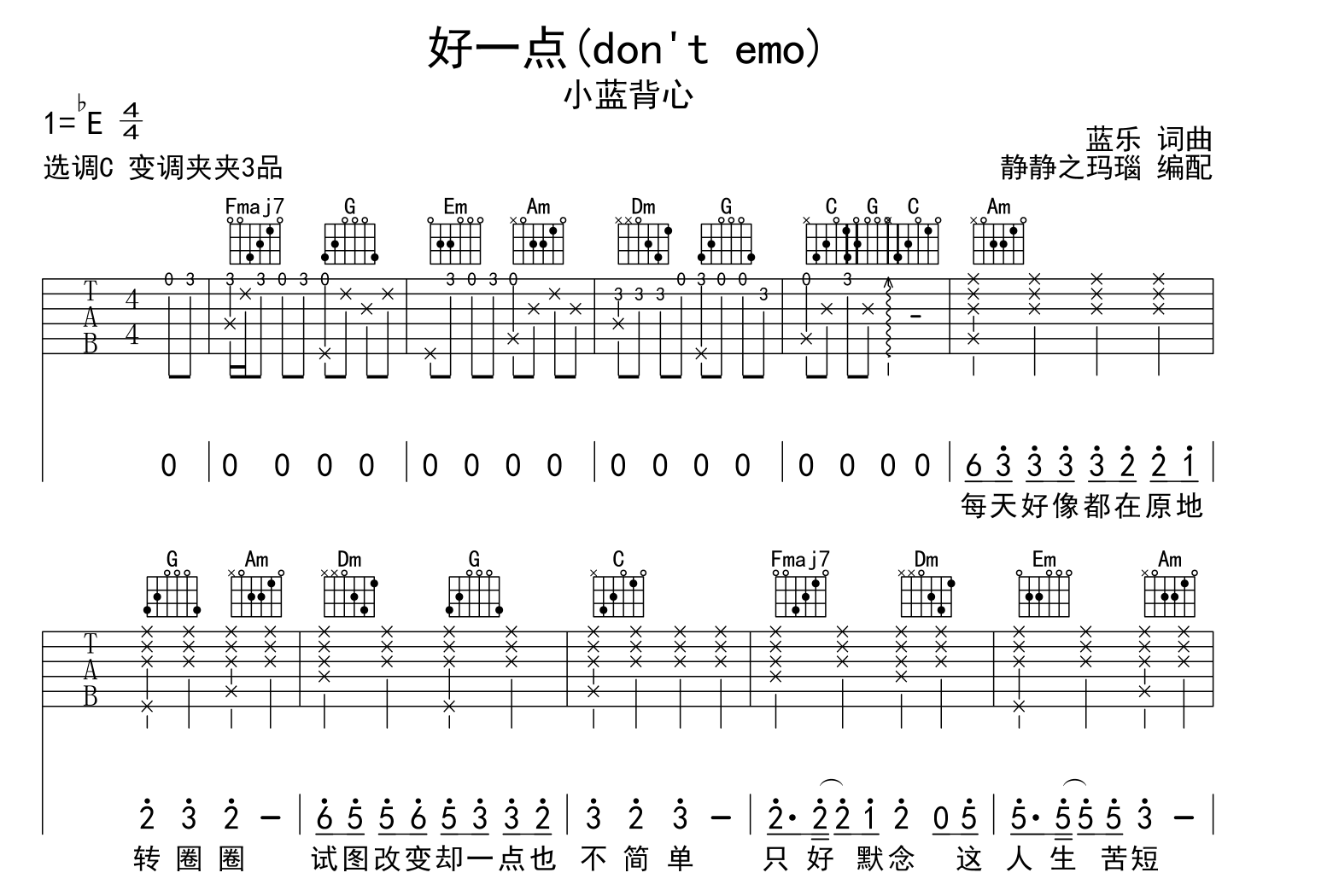 曲谱介绍: 好一点(don't emo)吉他谱,小蓝背心演唱,好一点(don't emo)六线谱,共三张图片谱,本谱采用C调和弦指法编配,节奏为4/4拍,速度为95拍每分钟,弹唱建议变调夹夹3品,也可以根据个人嗓音找到一个舒服的位置,难度初级,本谱由@静静之玛瑙制谱。