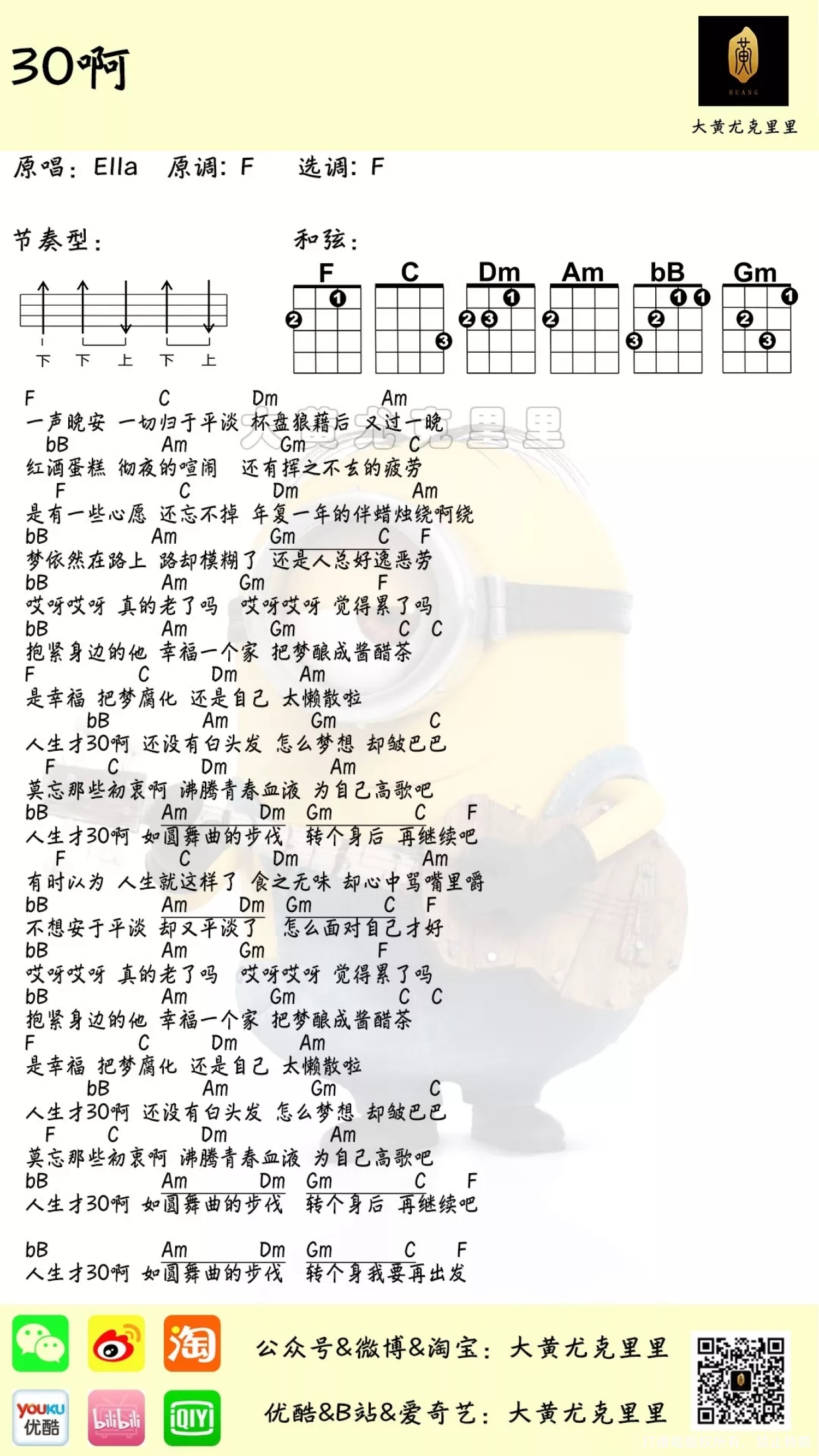 曲谱介绍: Ella《30啊》尤克里里谱,共有1张高清图谱,免翻页排版设计。