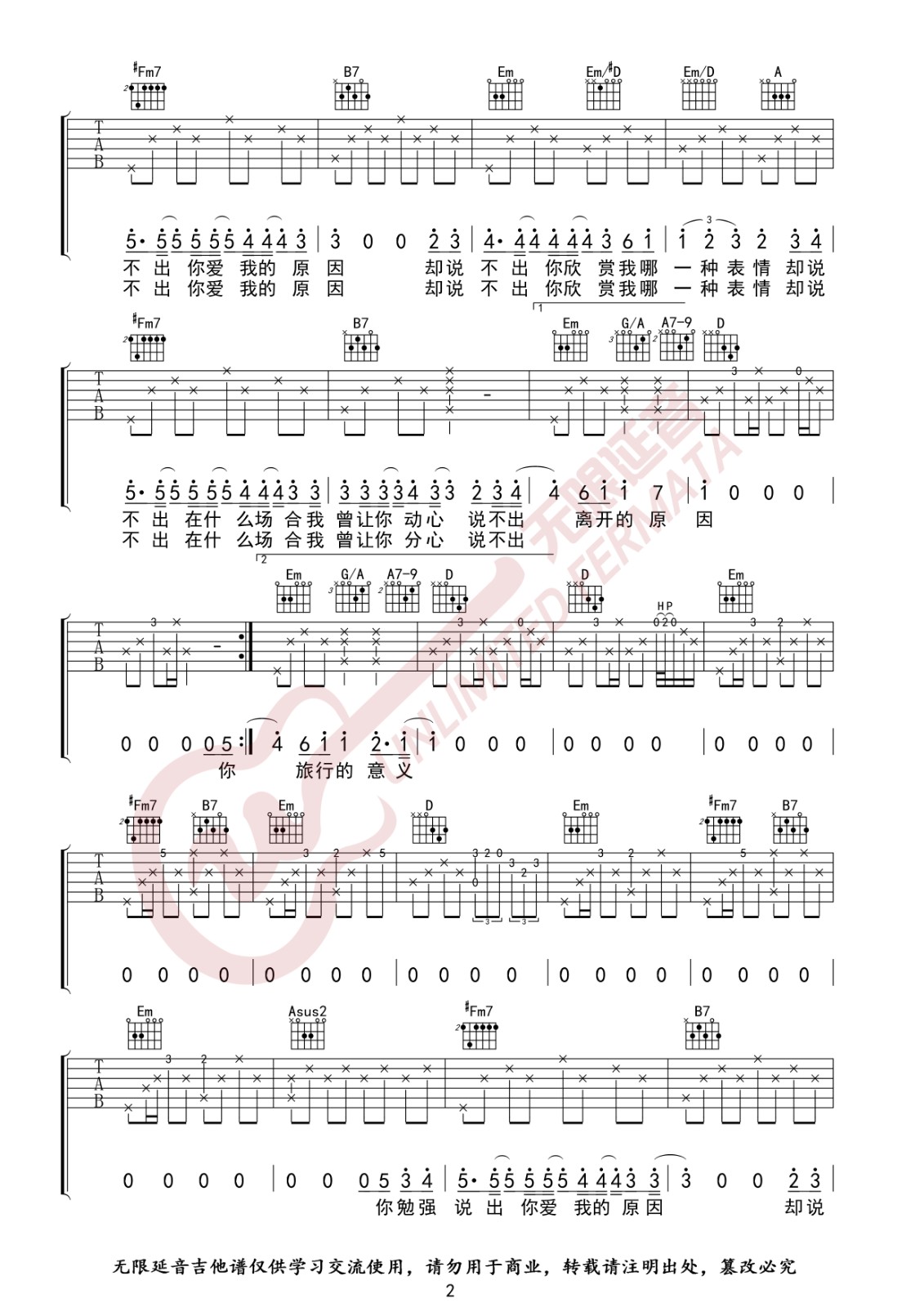 曲谱介绍: 陈绮贞《旅行的意义》吉他弹唱谱,采用D调指法编配,无限延音编配出品,共有3张高清图谱。