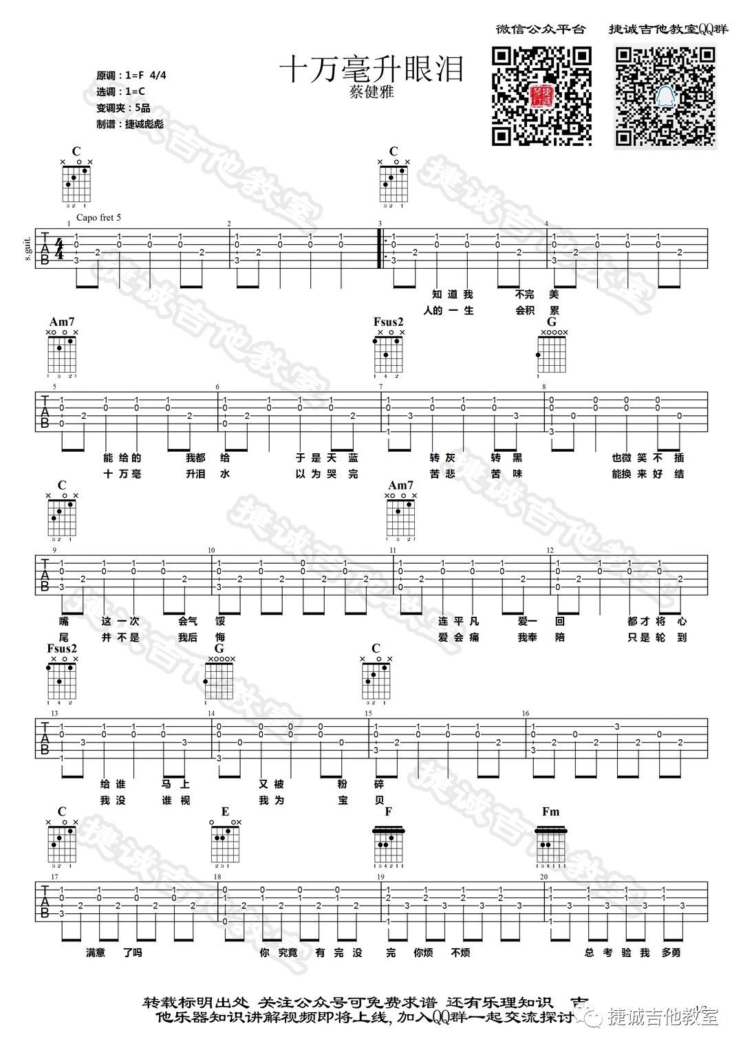 曲谱介绍: 蔡健雅《十万毫升眼泪》吉他弹唱谱,采用C调指法编配,鹤唳吉他教室编配出品,共有3张高清图谱。