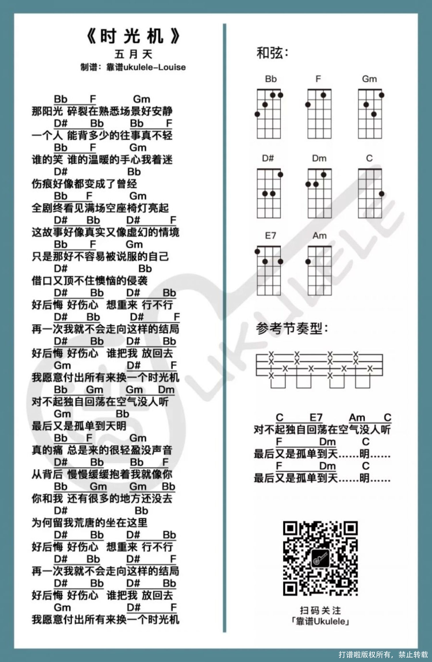 曲谱介绍: 哆啦A梦,蓝色没有耳朵的猫型机器人,有一个让人羡慕的百宝袋,各种各样道具让人应接不暇,可是我最想试试的道具之一还是时光机,仿佛有了它你能去到过去……像歌里唱的,如果再有一次机会结局就能有所不同…… 也看过一些关于时光旅行的电影,虽然创造出了时光机(或有时间旅行的能力),拥有改变的机会,但有些人、事、结局就像是早就已经写好了一样,最终有一个自己的去向…… 通过时光机去改变某个空间或某个时间点发生的事情,也许此刻也就不存在了,所以即便真的有时光机可以进行时间旅行,似乎我们也只能作为一个观察者……静静的看着历史/未来…… 看似可以改变的,最终也抵不过生老病死…… 两个版本的弹唱谱,一个原调,一个非原调,喜欢哪个选哪个!~   《时光机》创作背景是在怪兽妈妈生病时,所以这首歌带着满满悲伤……如果能有一次重来的机会,也许结果会少一些懊悔与自责……   版本一难度系数:★★ 和弦切换上可能没有那么顺手,很喜欢这首歌但是这个版本对我来说太低了……   版本二难度系数:★☆ 和弦上来说,除了F#和Bm看着有大横按很难(其实它们出现次数也就一次),其他和弦都是常见的无敌和弦。 虽然和弦好按的版本,不过这个版本的调偏高了,可能更适合女生一些。