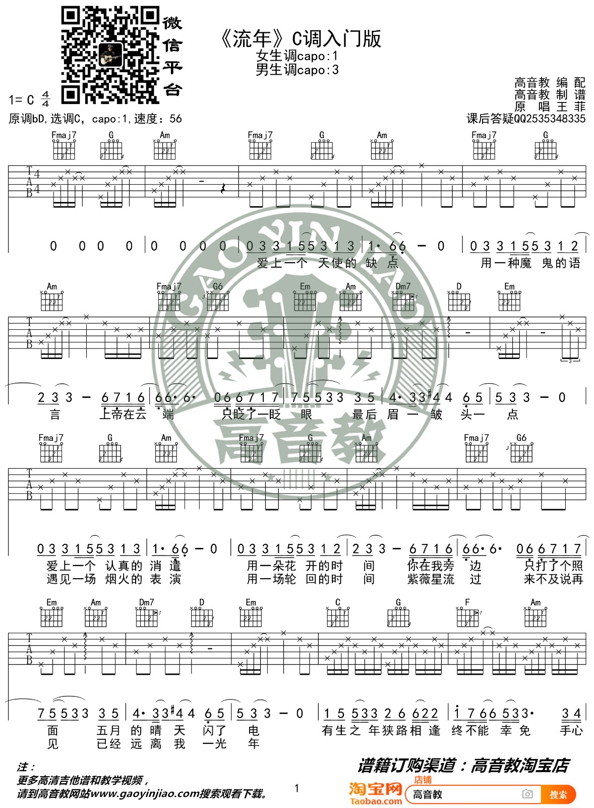 曲谱介绍: 王菲《流年》吉他弹唱谱,采用C调指法编配,高音教编配出品,共有2张高清图谱,免翻页排版设计。