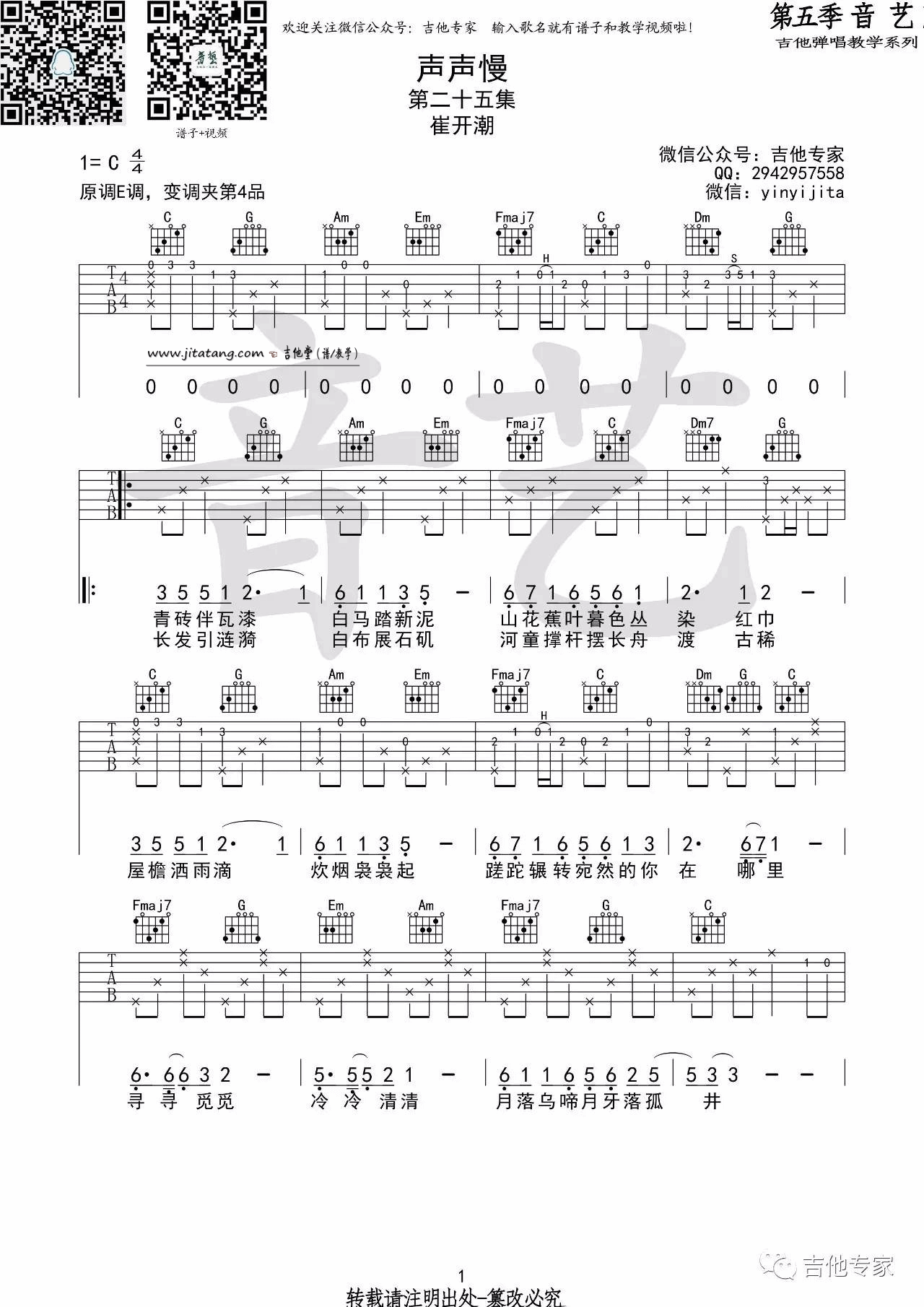 曲谱介绍: 崔开潮《声声慢》吉他弹唱谱,采用C调指法编配,音艺吉他编配出品,共有3张高清图谱。