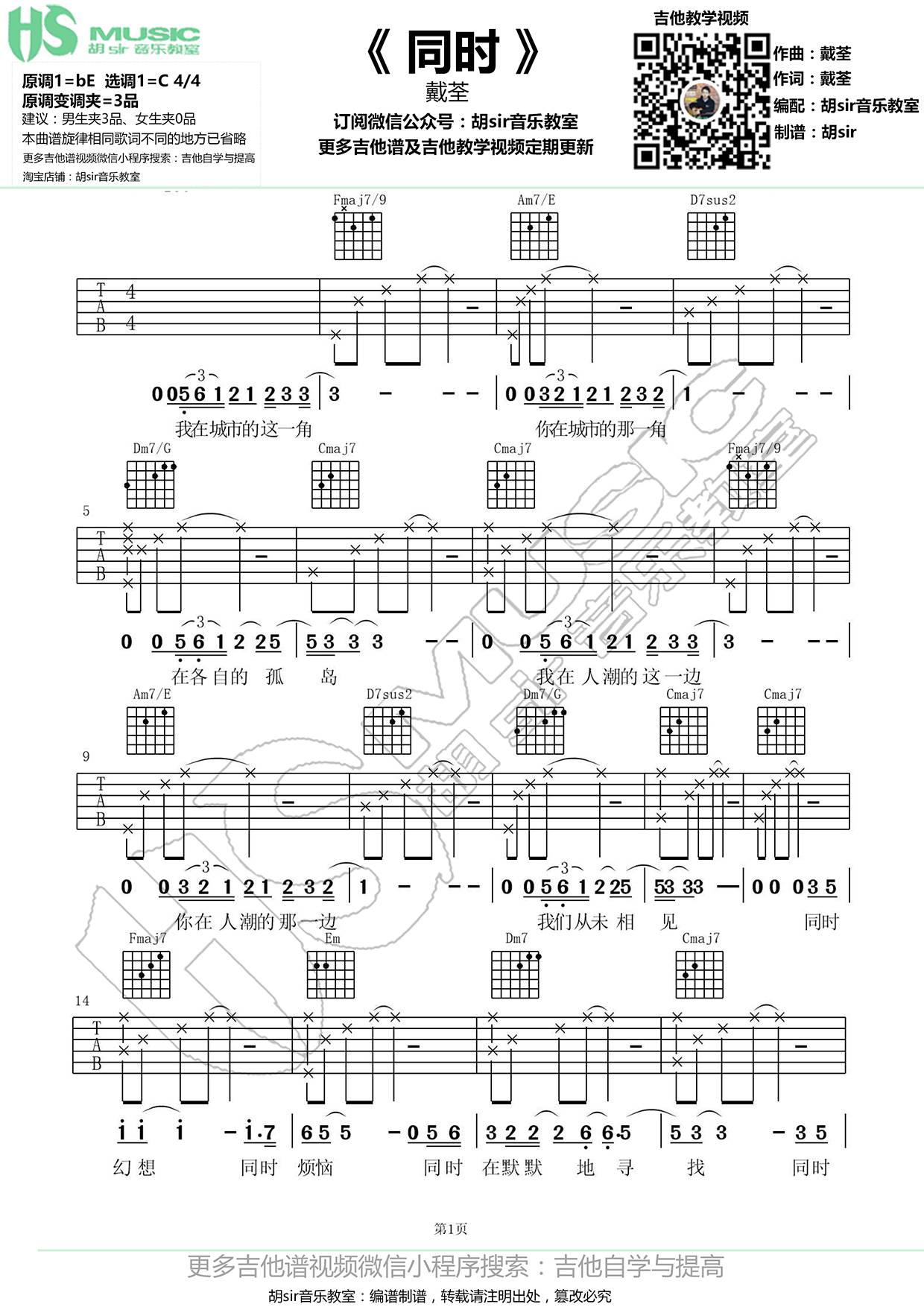 曲谱介绍: 戴荃《同时》吉他弹唱谱,采用C调指法编配,胡Sir吉乐教室编配出品,共有3张高清图谱。