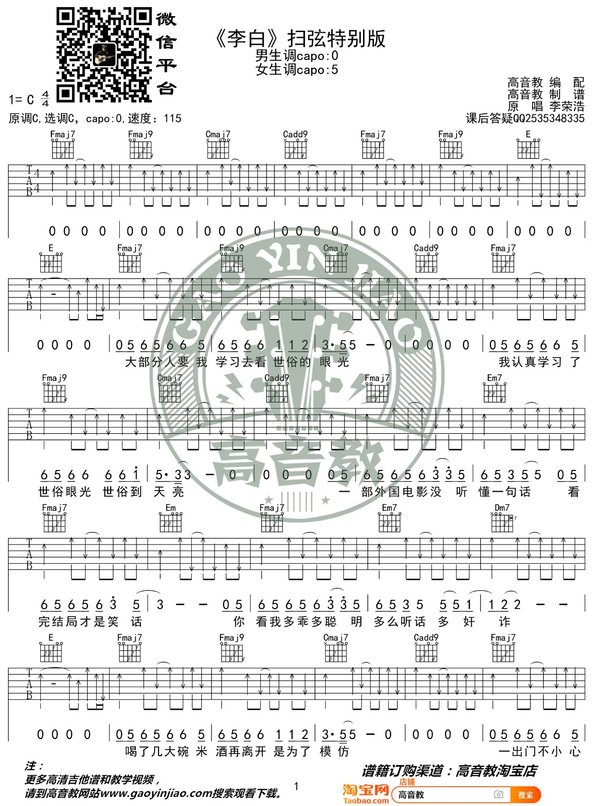 曲谱介绍: 李荣浩《李白》吉他弹唱谱,采用C调指法编配,高音教编配出品,共有2张高清图谱,免翻页排版设计。