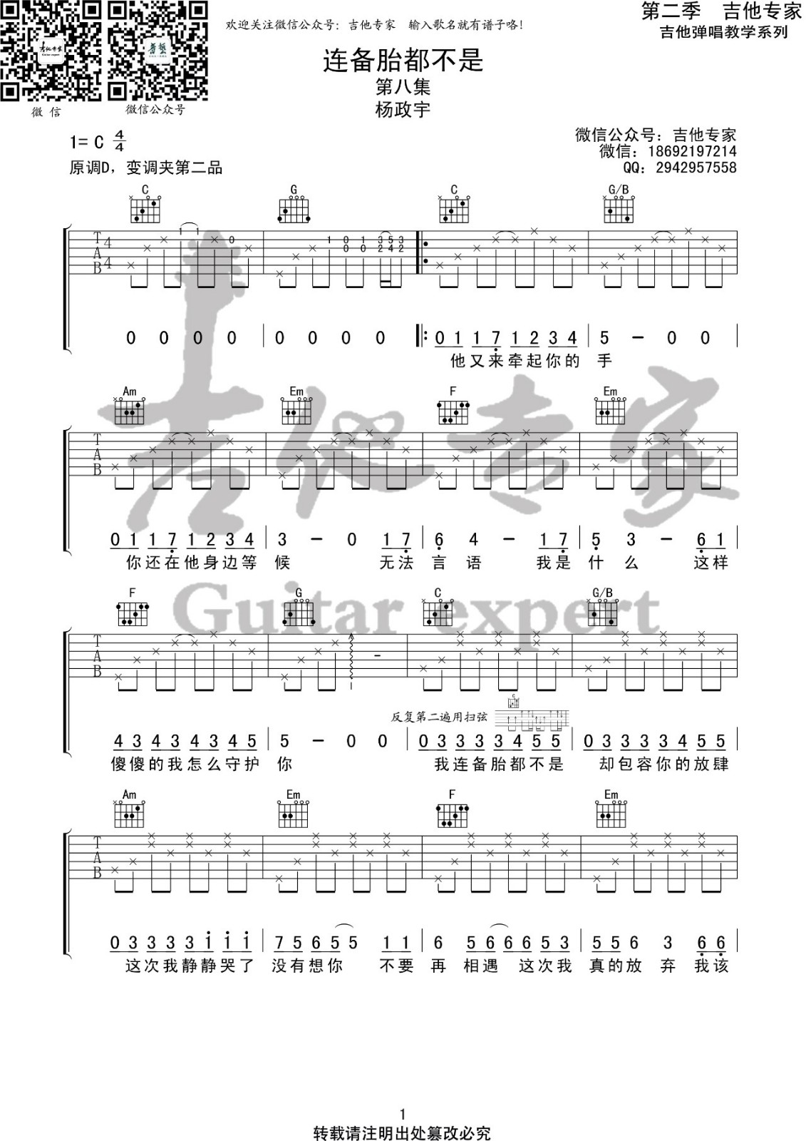 曲谱介绍: 杨振宇《连备胎都不是》吉他弹唱谱,采用C调指法编配,吉他专家编配出品,共有2张高清图谱,免翻页排版设计。
