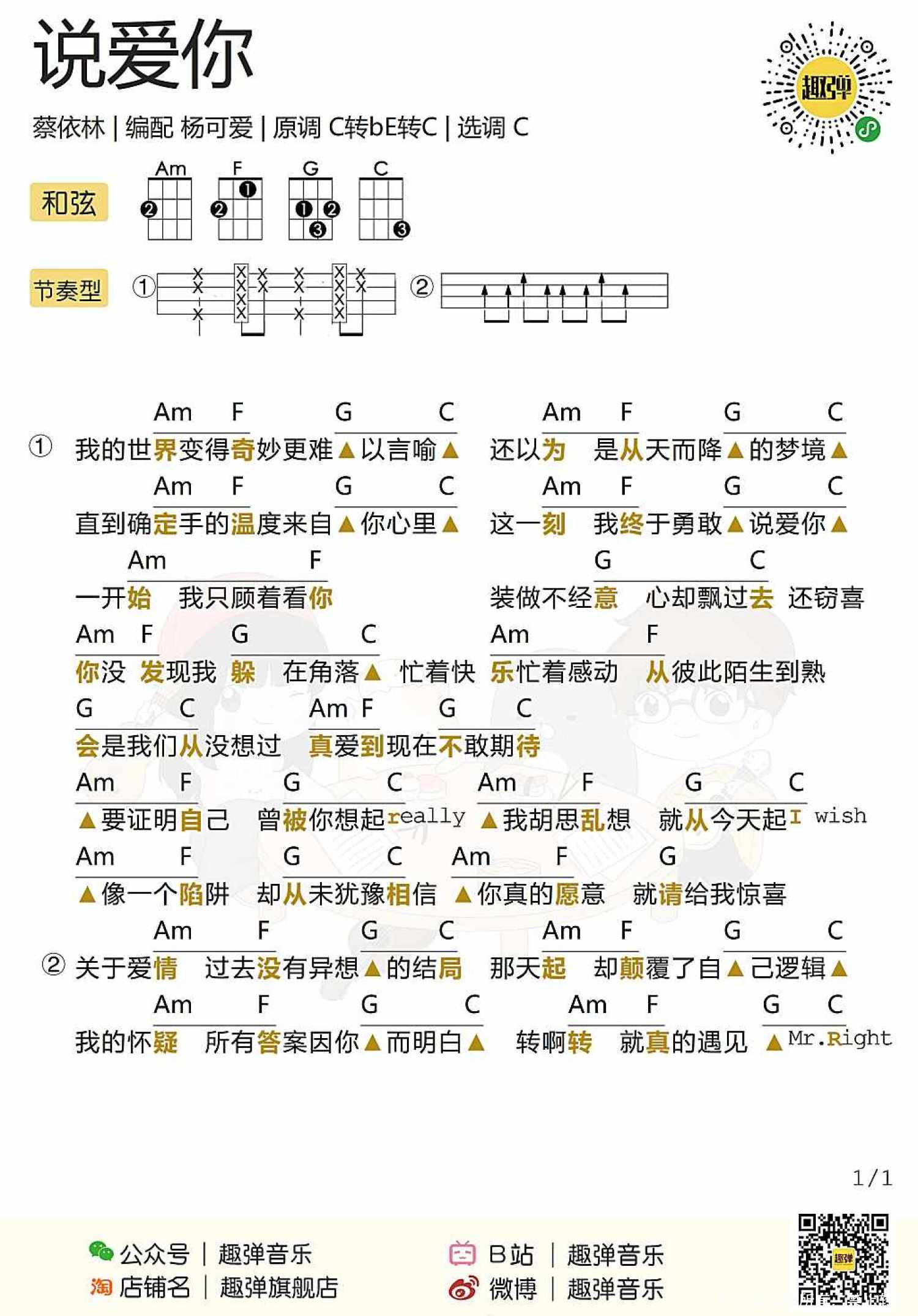 曲谱介绍: 弹唱演示 弹唱教学 尤克里里弹唱谱 目录 来自趣弹大家庭的倾情提醒 还有一周就是520了! 想要过节的小伙伴们 先要学会第一步! 鼓起勇气,大声「说爱你」~ 那么,今天来听听可爱怎么「说爱你」的 再跟着她学会用尤克里里弹唱 把这首歌唱给喜欢的人听吧~   弹唱演示 ◎ 网易云搜索电台【杨可爱尤克里里小窝】,找到这首歌曲循环播放~ 这首曲子真的非常有魔力 一听到心情就会变得非常雀跃~   弹唱教学   尤克里里弹唱谱