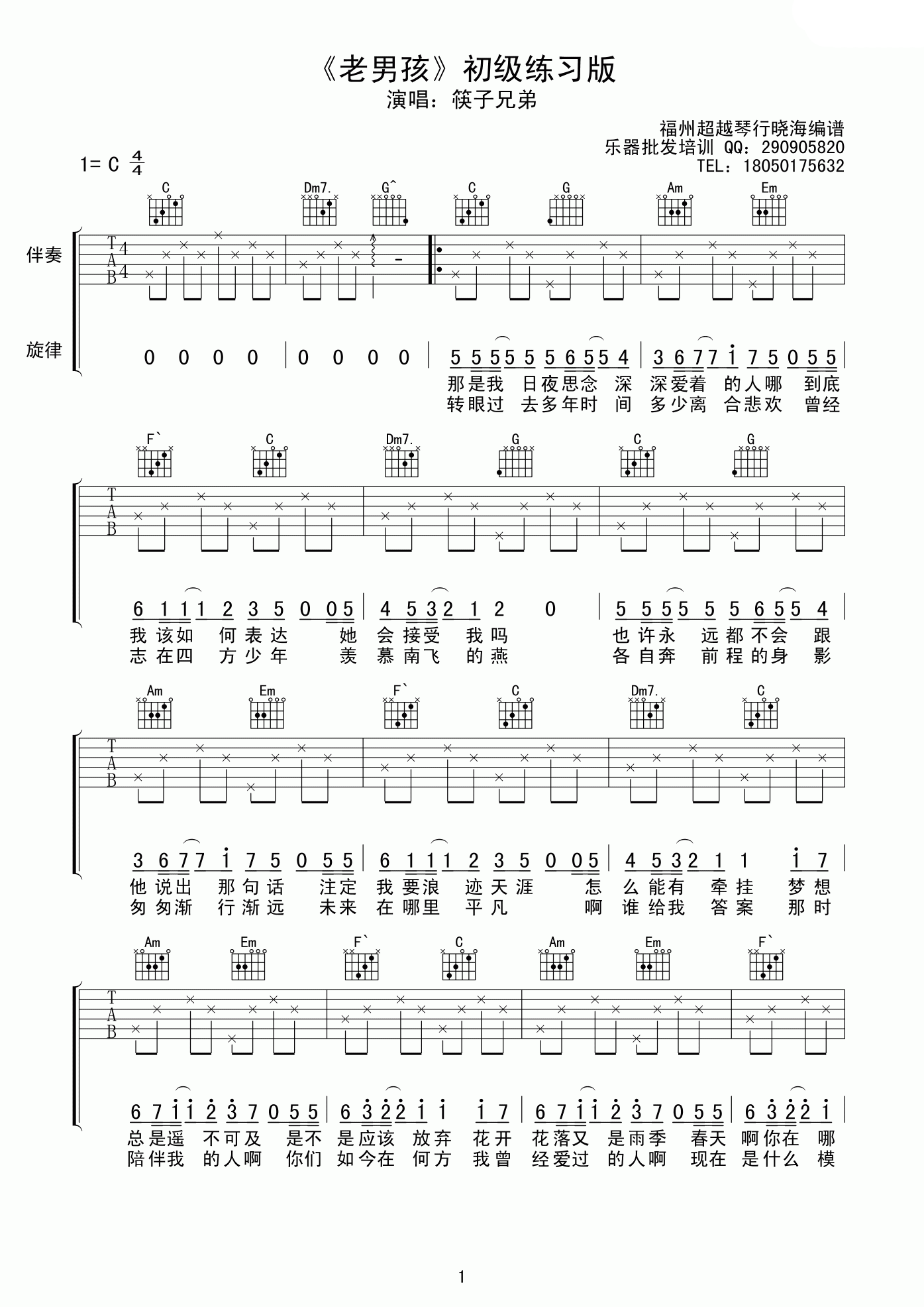 曲谱介绍: 筷子兄弟《老男孩》吉他弹唱谱,采用C调指法编配,超越琴行编配出品,共有2张高清图谱,免翻页排版设计。