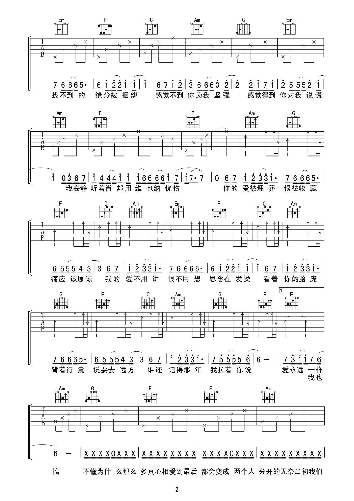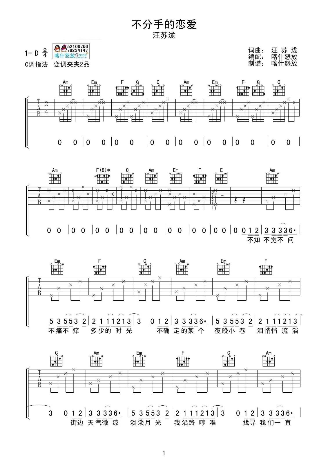 曲谱介绍: 汪苏泷《不分手的恋爱》吉他弹唱谱,采用C调指法编配,喀什怒放编配出品,共有3张高清图谱。