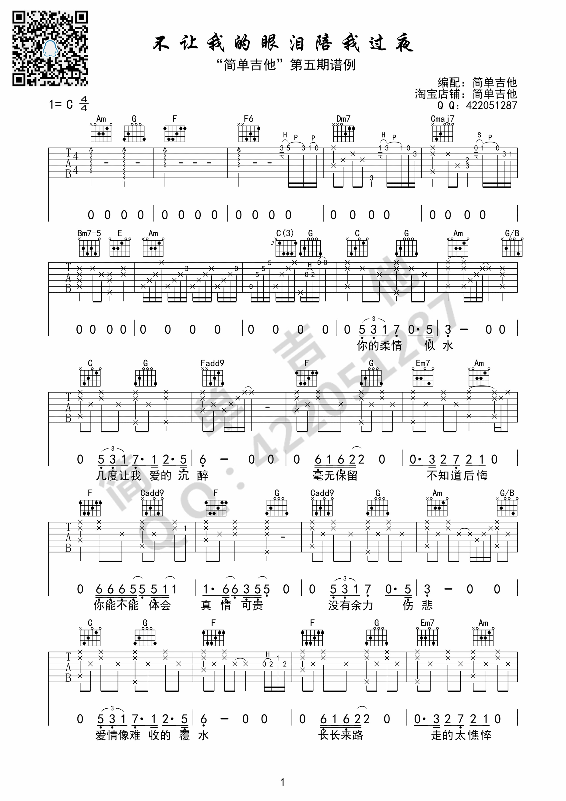 曲谱介绍: 齐秦《不让我的眼泪陪我过夜》吉他弹唱谱,采用C调指法编配,简单吉他编配出品,共有3张高清图谱。