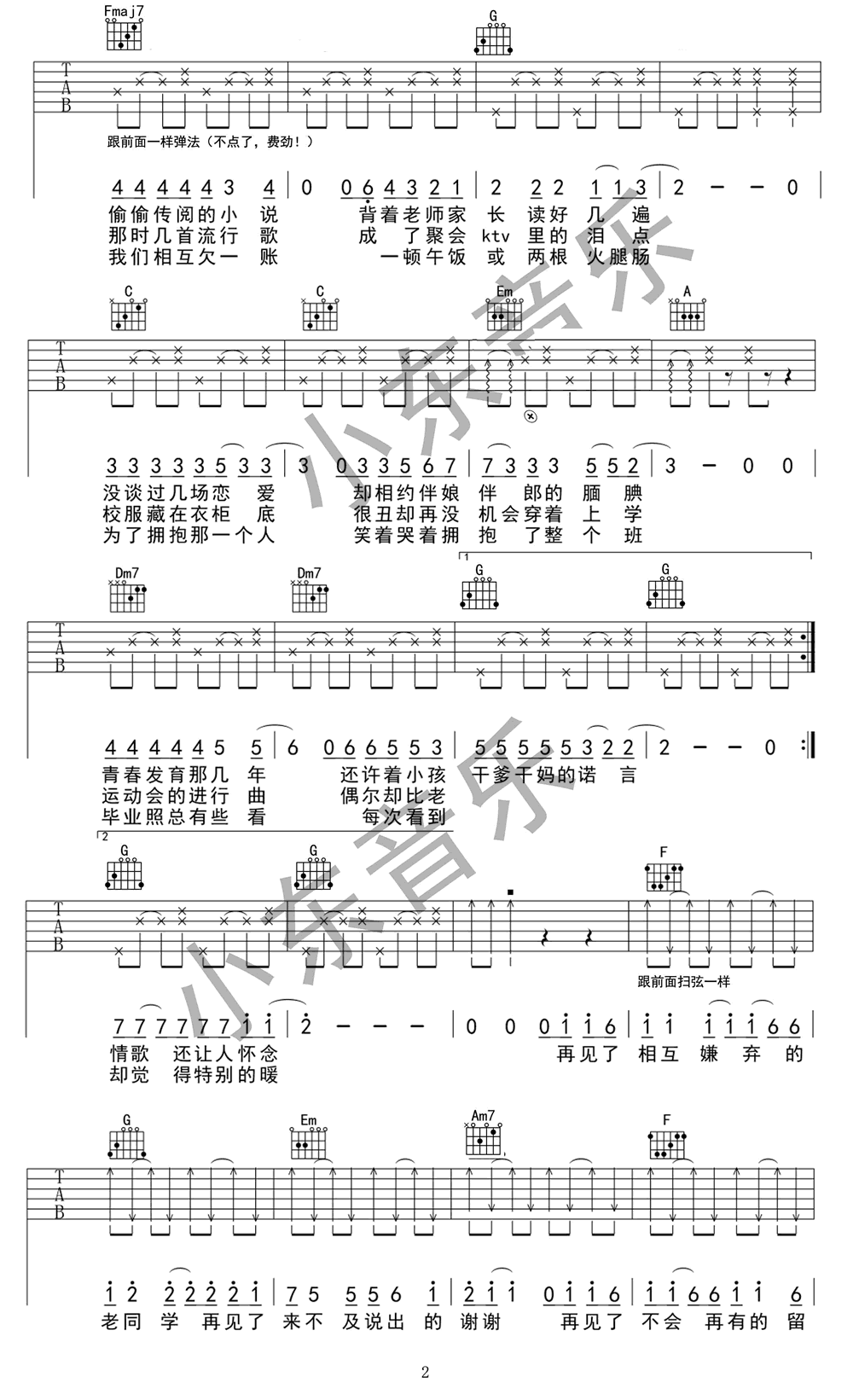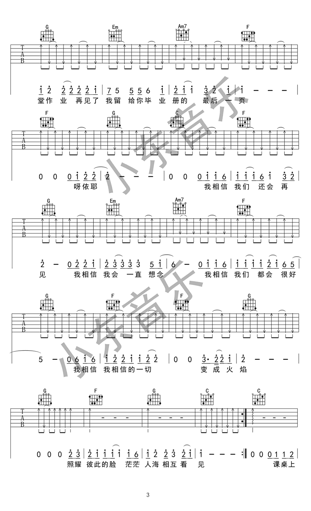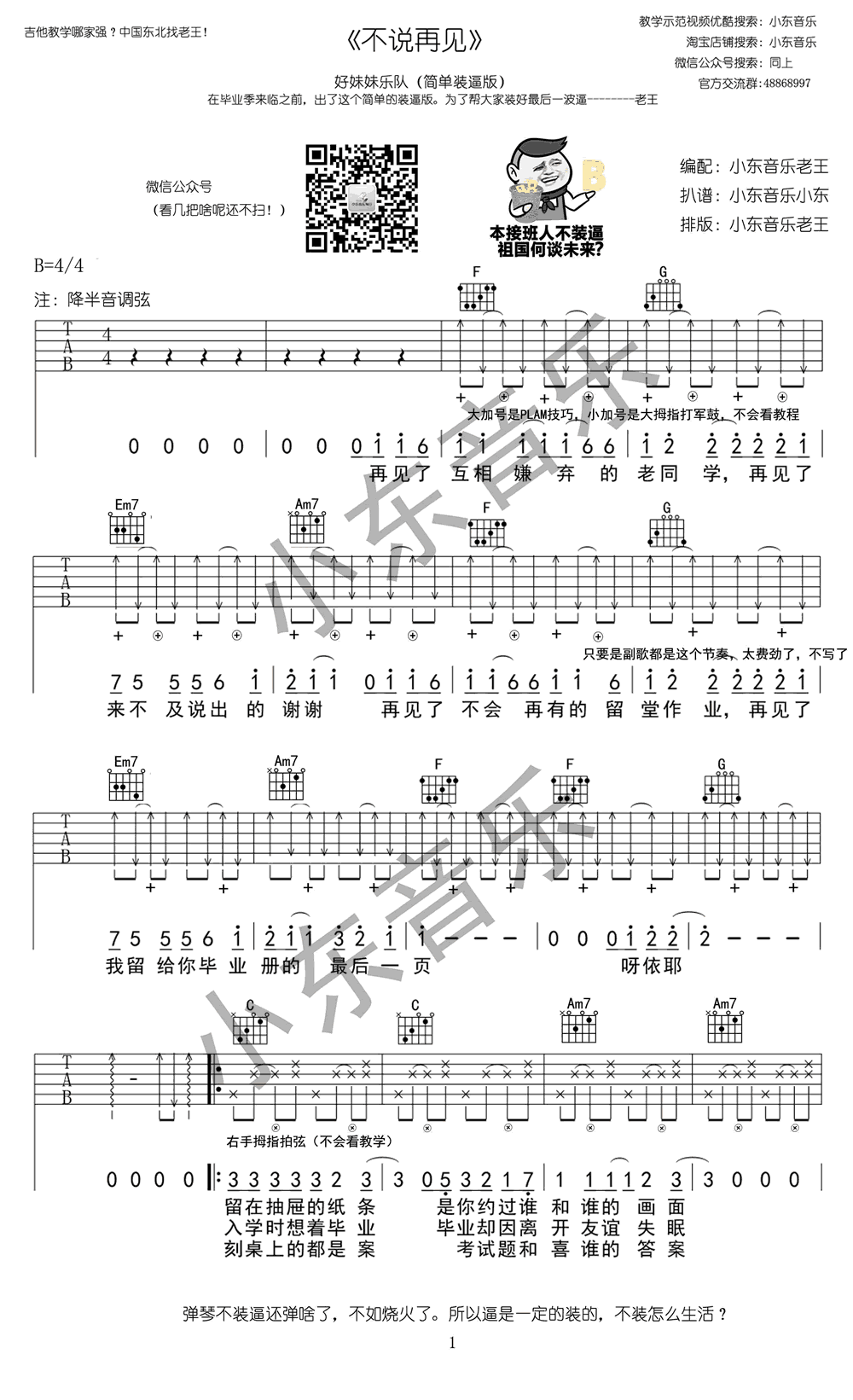 曲谱介绍: 好妹妹乐队《不说再见》吉他弹唱谱,采用C调指法编配,小东音乐编配出品,共有4张高清图谱。