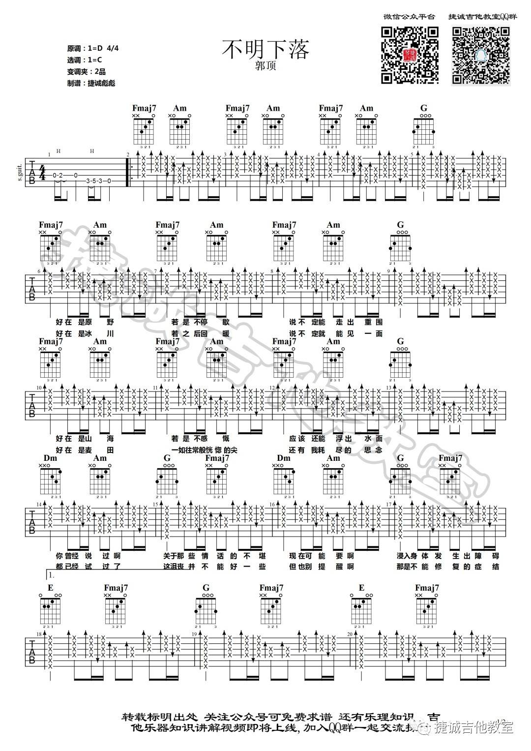 曲谱介绍: 郭顶《不明下落》吉他弹唱谱,采用C调指法编配,捷诚吉他教室编配出品,共有2张高清图谱,免翻页排版设计。
