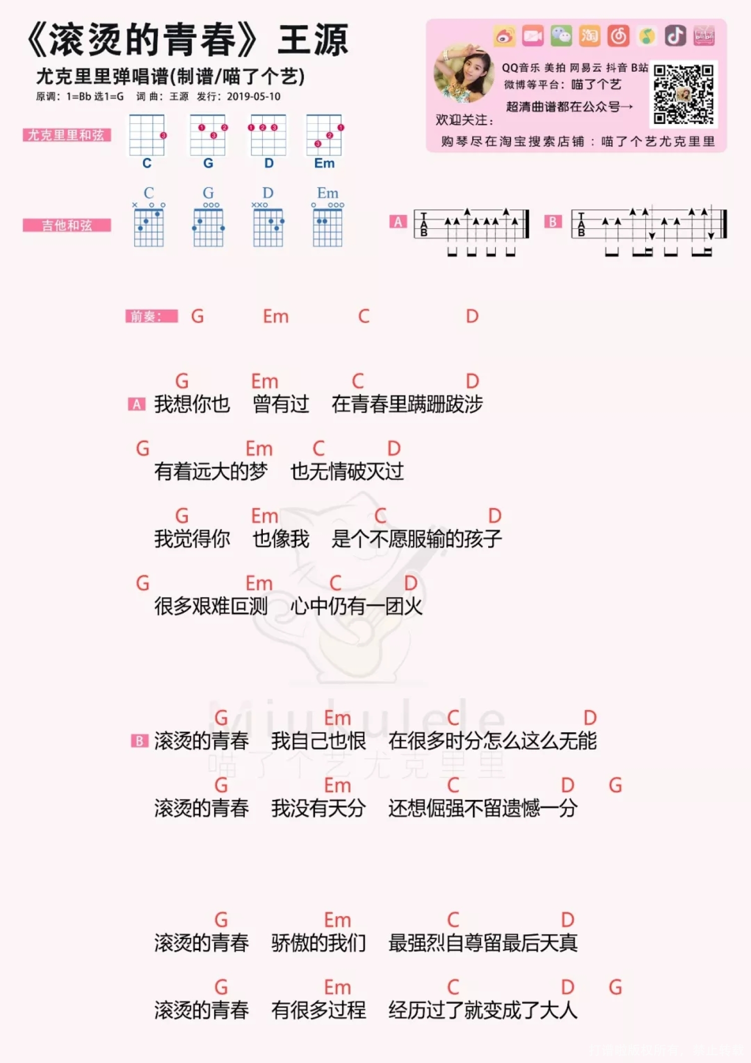 曲谱介绍: 《滚烫的青春》这首是王源作词作曲并在我是唱作人上半季最后一场唱的歌,这也是自从《我是唱作人》以来,我对他最刮目相看的一次。 最后一场,谁也不知道结果如何,所以王源这场也算是拼了。他上台说要观众一起打拍子录进去,加上他的贝斯、吉他、钢琴,变成一种音乐玩法,虽然我不懂,但没想到王源这么有想法,其实他一直在不断尝试,挑战新的东西。   现场版   尤克里里\吉他曲谱