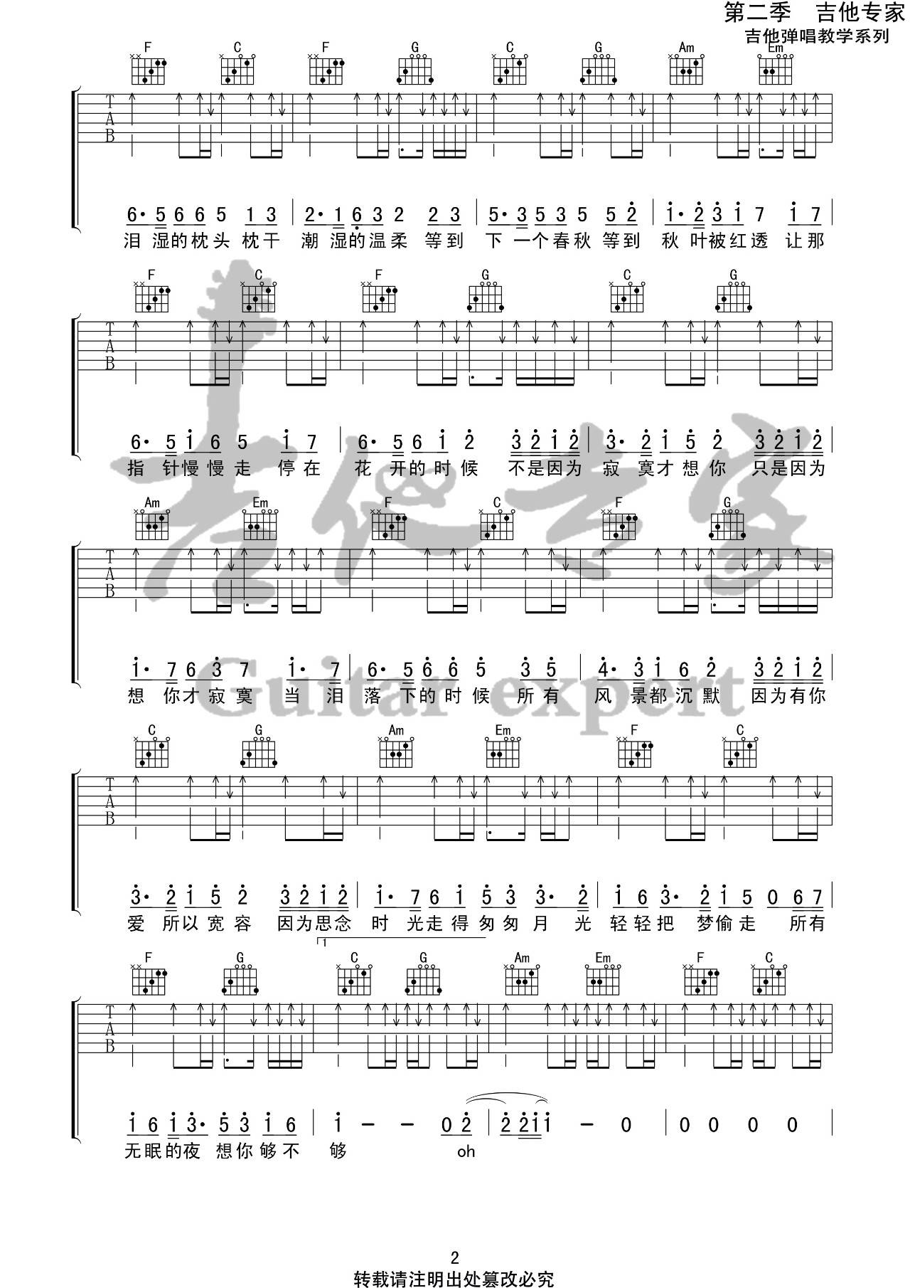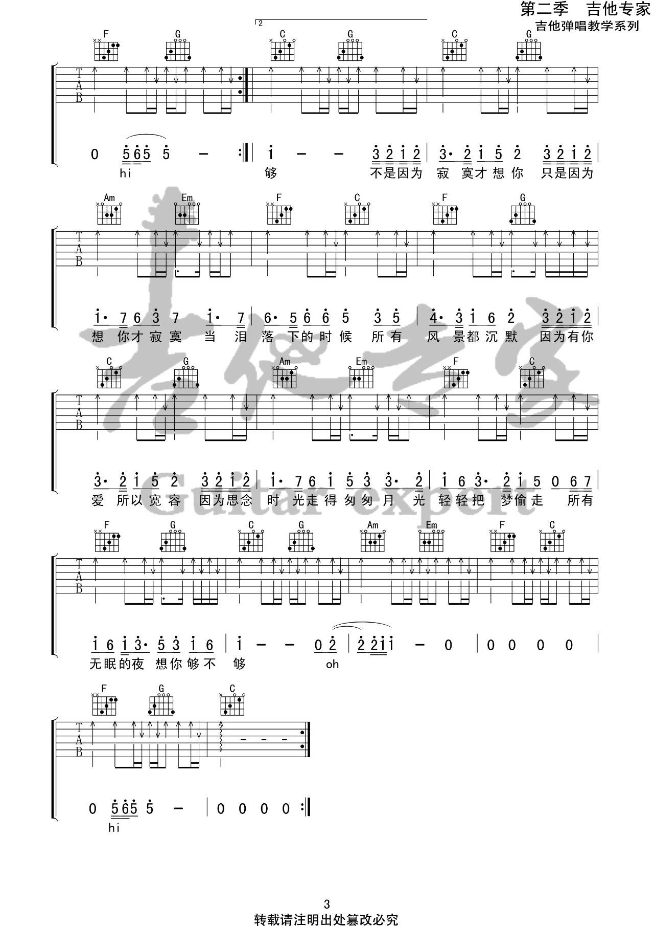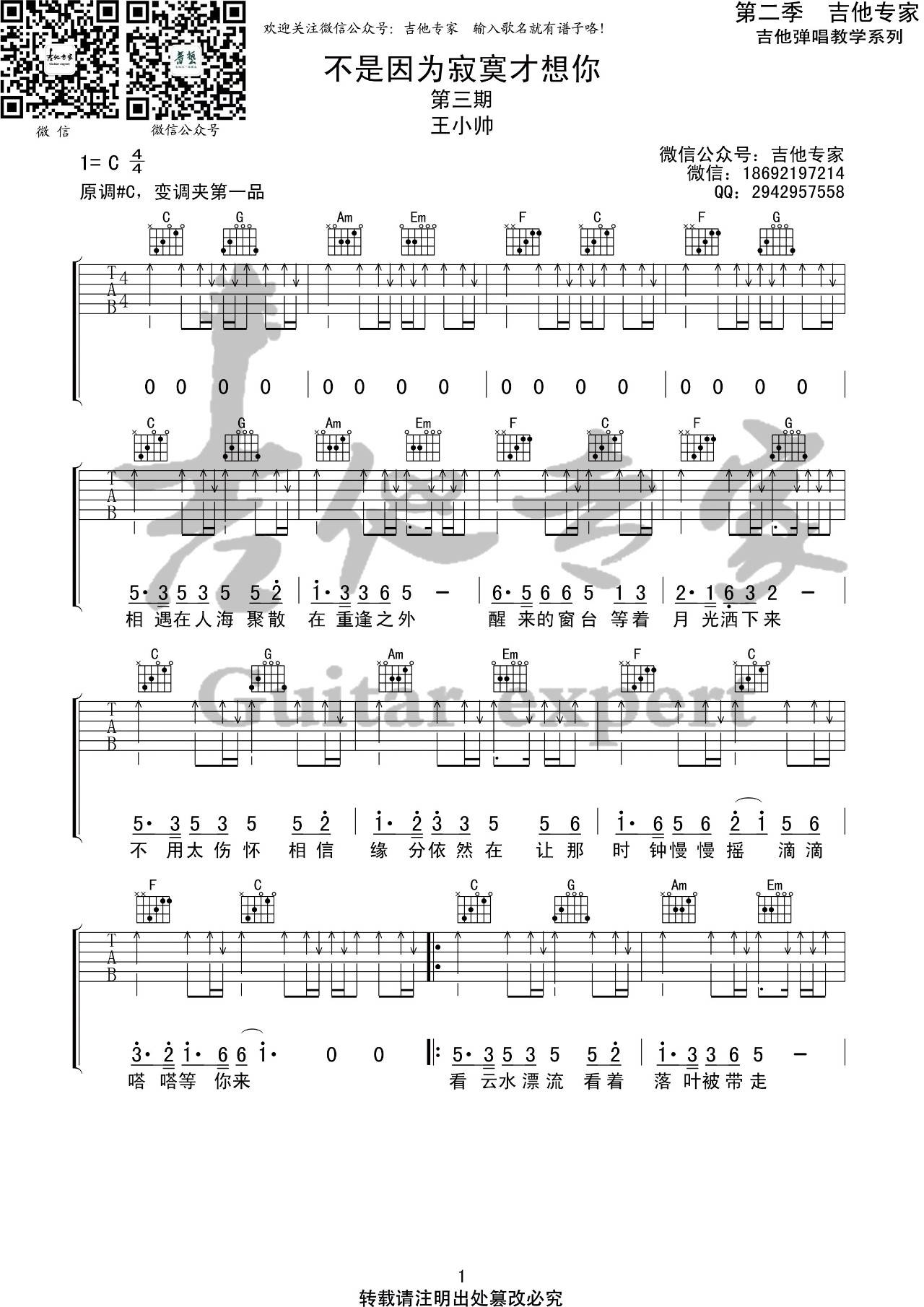 曲谱介绍: 《不是因为寂寞才想你》吉他弹唱谱,采用C调指法编配,吉他专家编配出品,共有3张高清图谱。