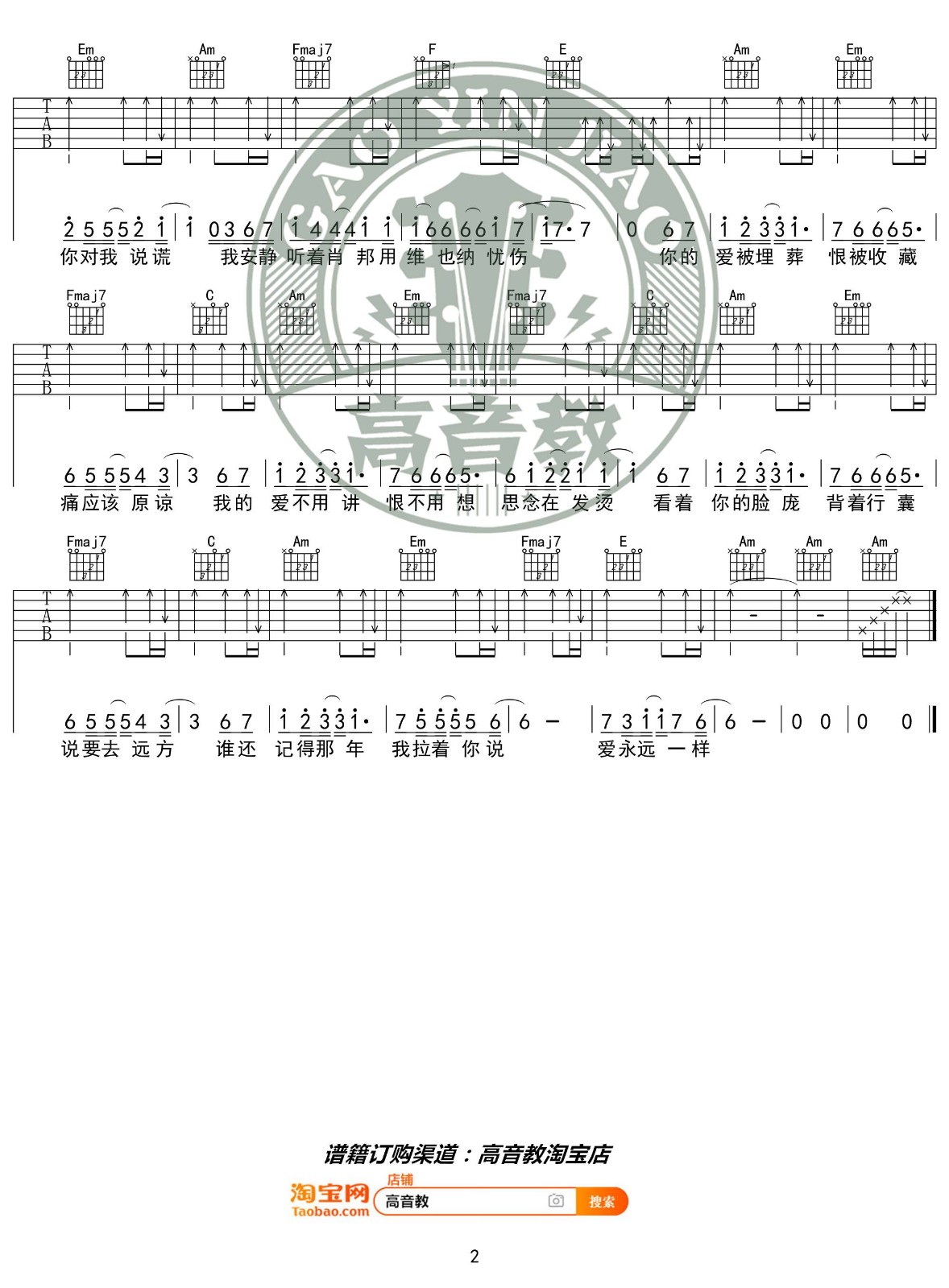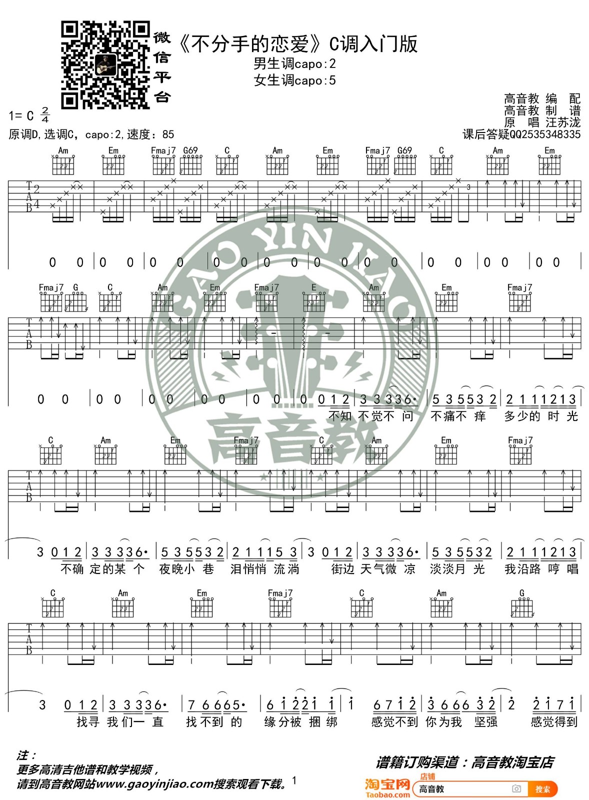 曲谱介绍: 汪苏泷《不分手的恋爱》吉他弹唱谱,采用C调指法编配,高音教编配出品,共有2张高清图谱,免翻页排版设计。