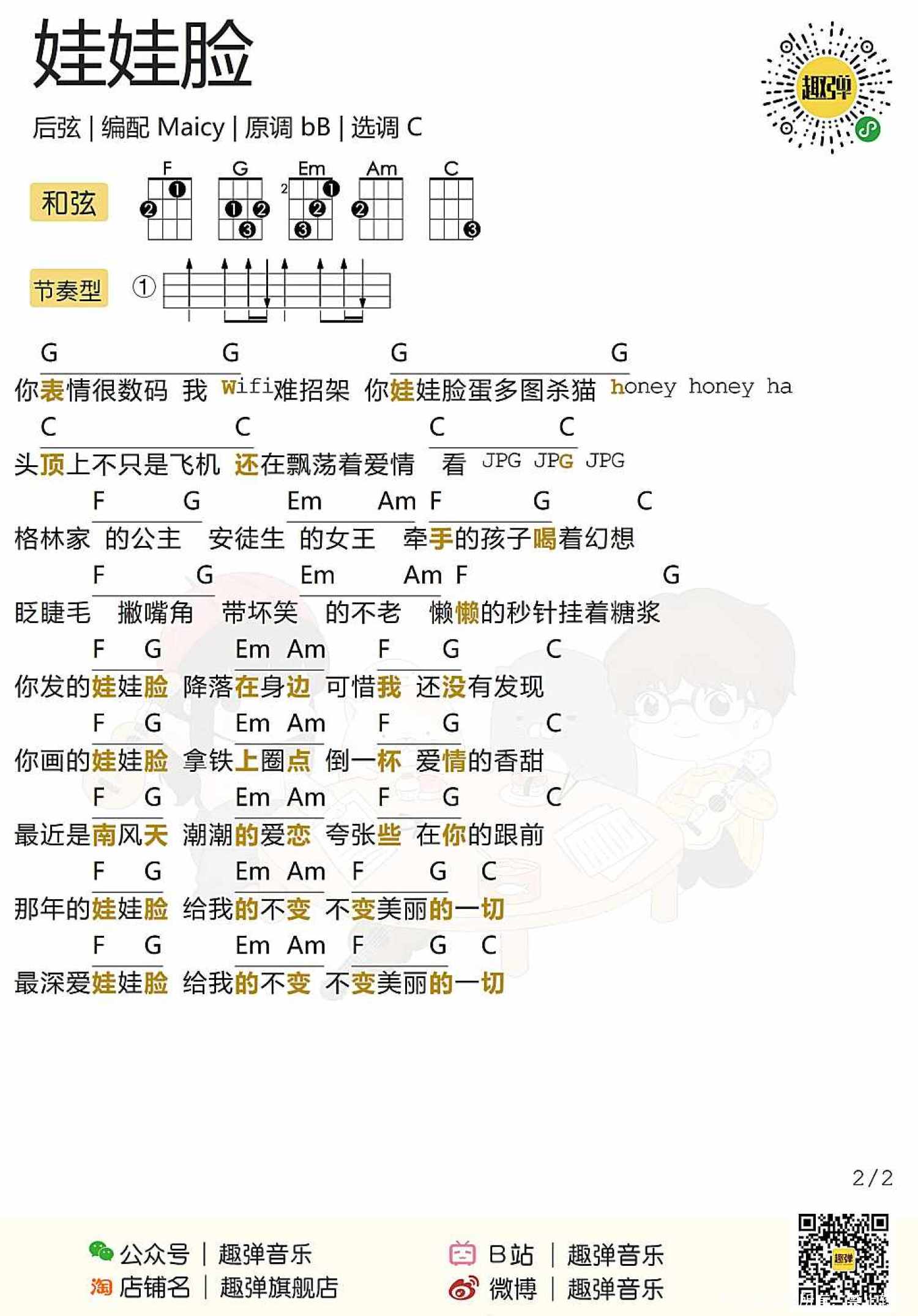 曲谱介绍: 后弦《娃娃脸》尤克里里谱,共有1张高清图谱,免翻页排版设计。