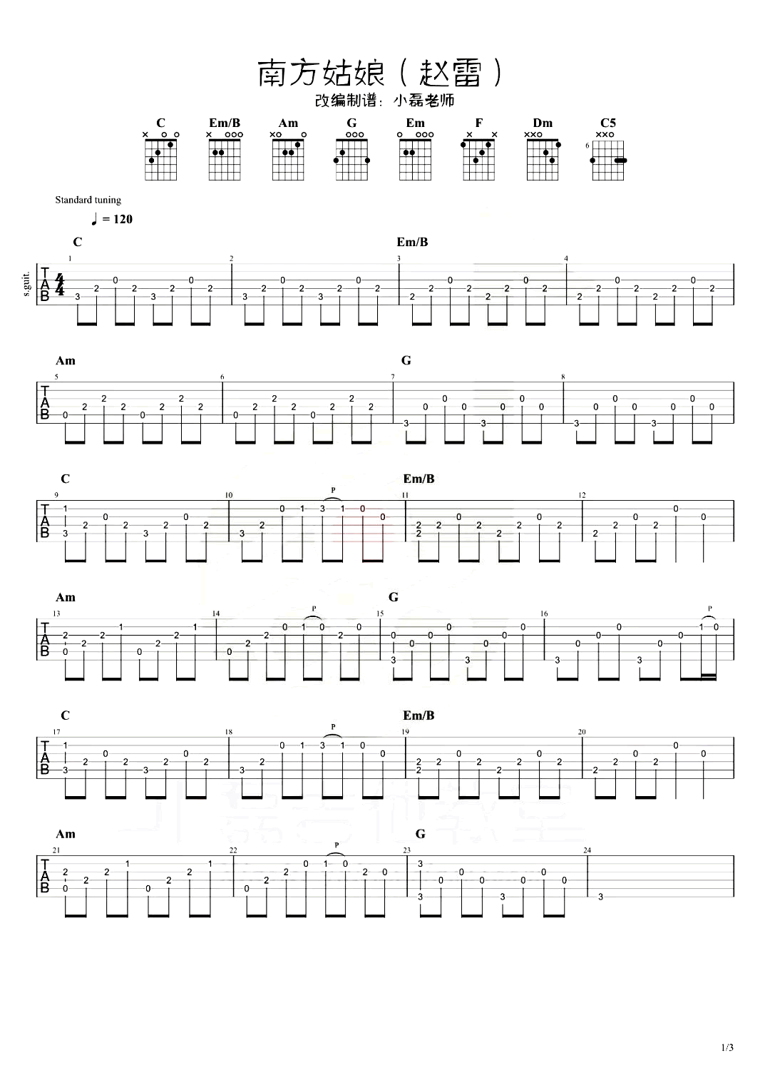 曲谱介绍: 附上曲谱配套《南方姑娘》吉他演示教学视频,歌曲整体难度不高,却很有辨识度,喜欢这首曲子的琴友们跟随小磊老师的示范讲解好好练习一下。