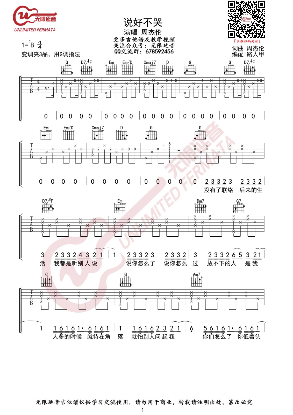 曲谱介绍: 周杰伦《说好不哭》吉他弹唱谱,采用G调指法编配,无限延音编配出品,共有3张高清图谱。