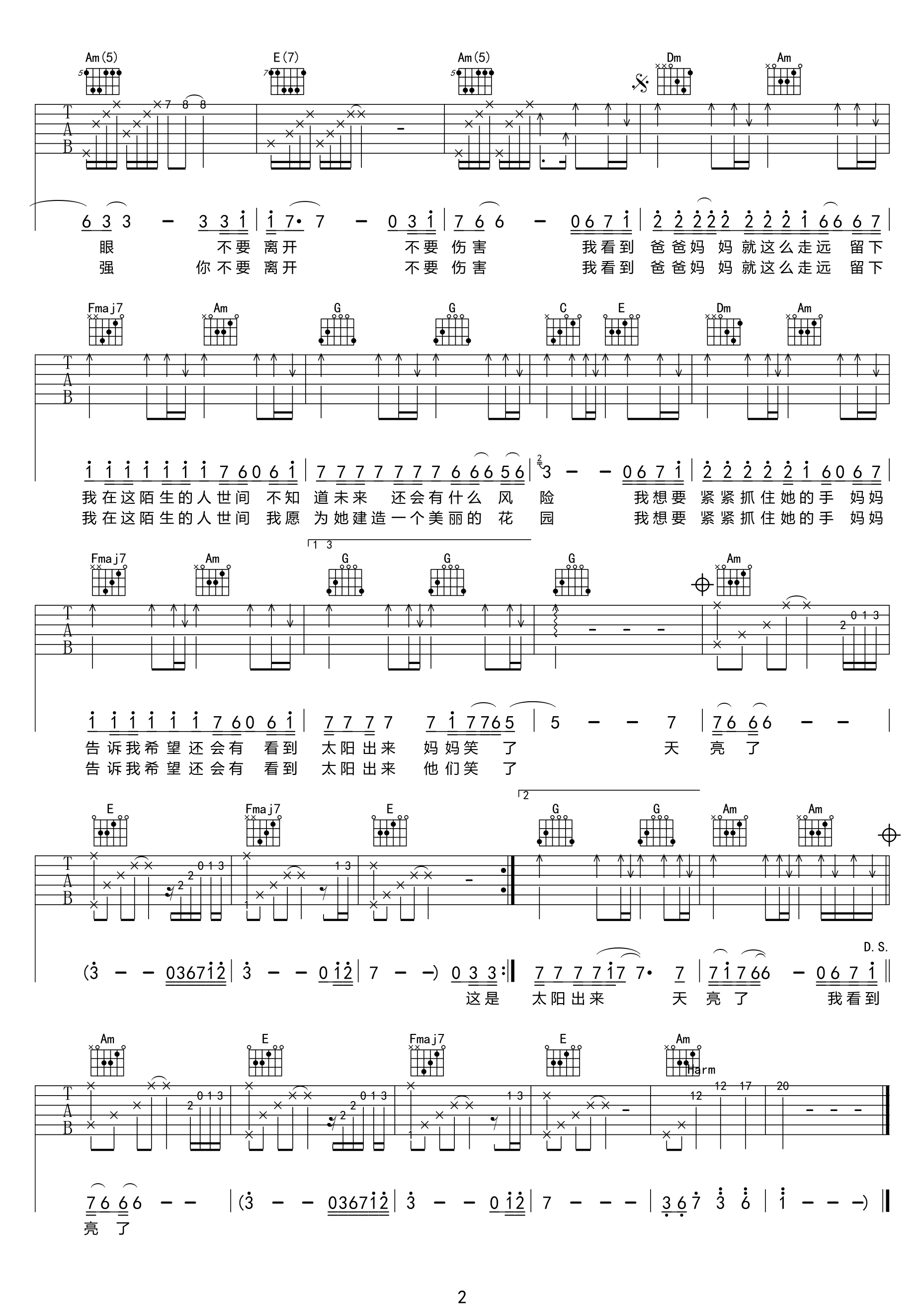 曲谱介绍: 17吉他《天亮了》吉他弹唱谱,采用C调指法编配,共有2张高清图谱,免翻页排版设计。