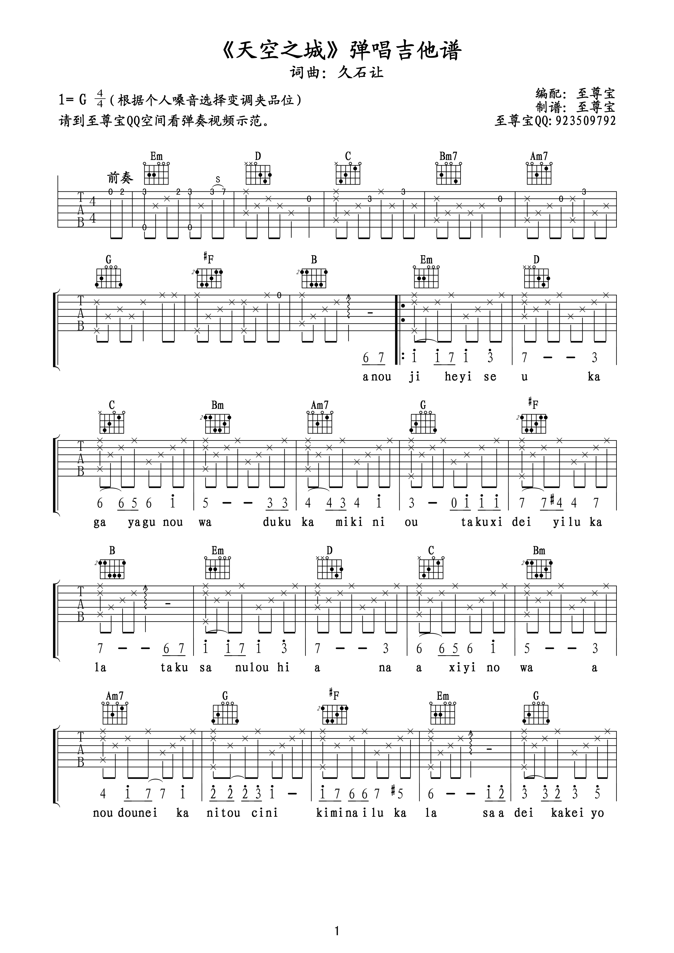 曲谱介绍: 久石让《天空之城》吉他弹唱谱,采用C调指法编配,至尊宝编配出品,共有2张高清图谱,免翻页排版设计。