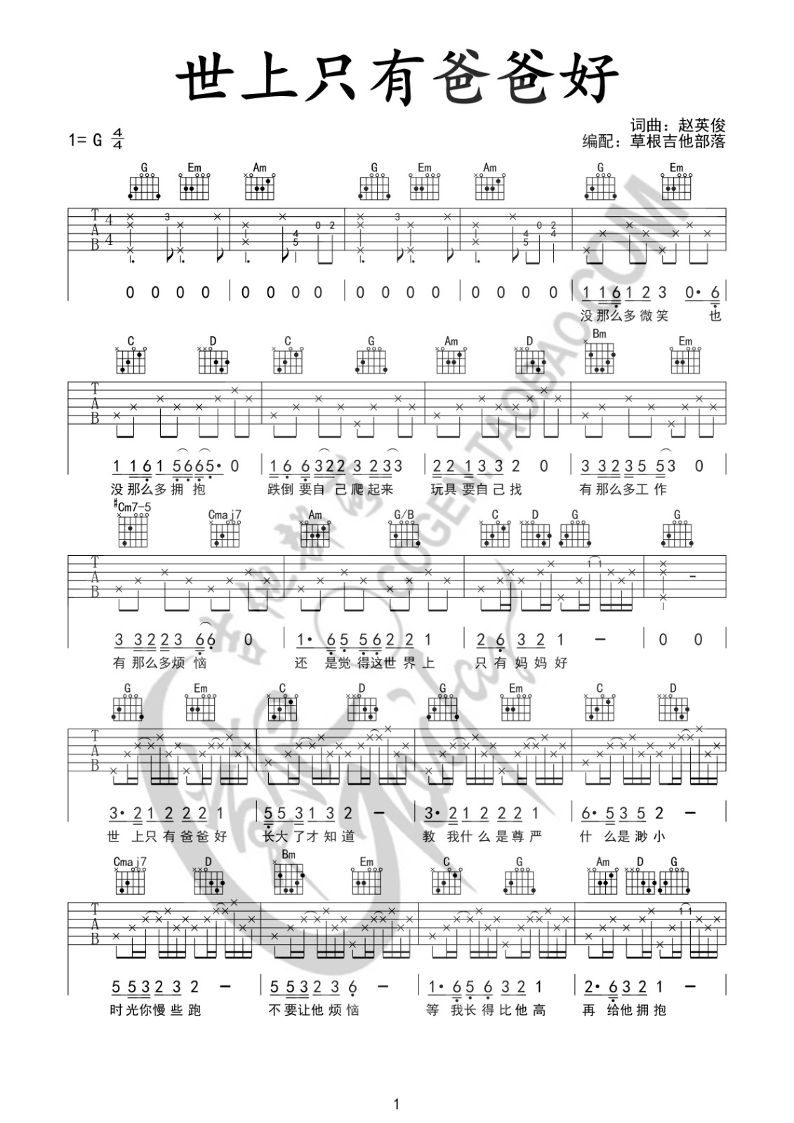 世上只有爸爸好吉他谱 - 赵英俊 - G调吉他弹唱谱
