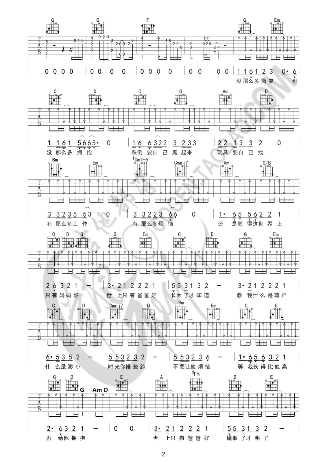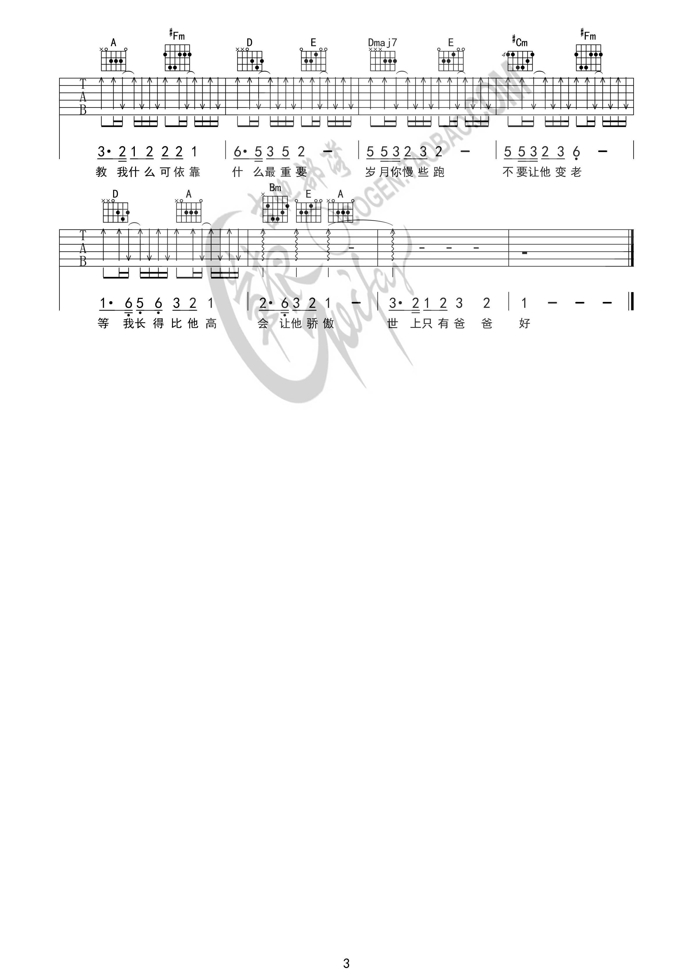曲谱介绍: 赵英俊《世上只有爸爸好》吉他弹唱谱,采用G调指法编配,共有3张高清图谱。