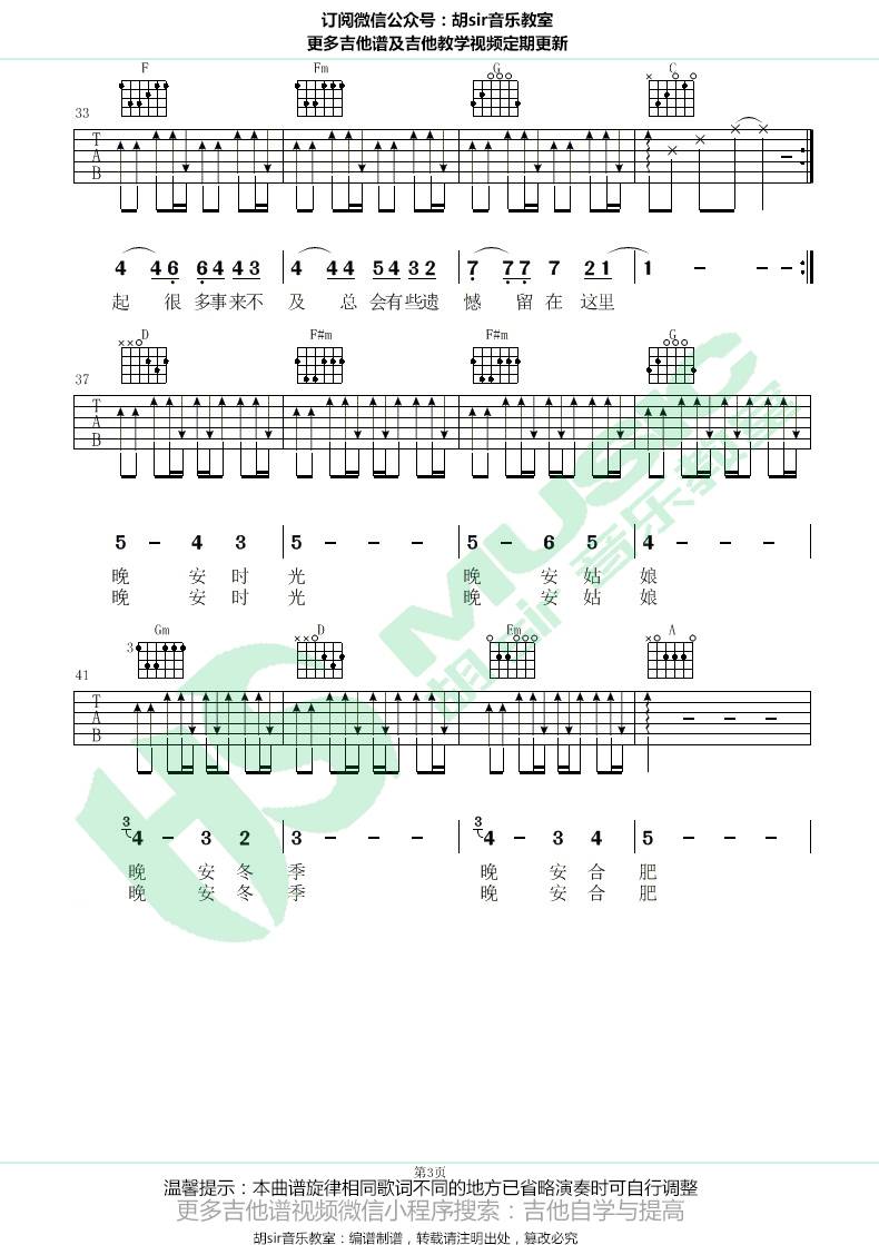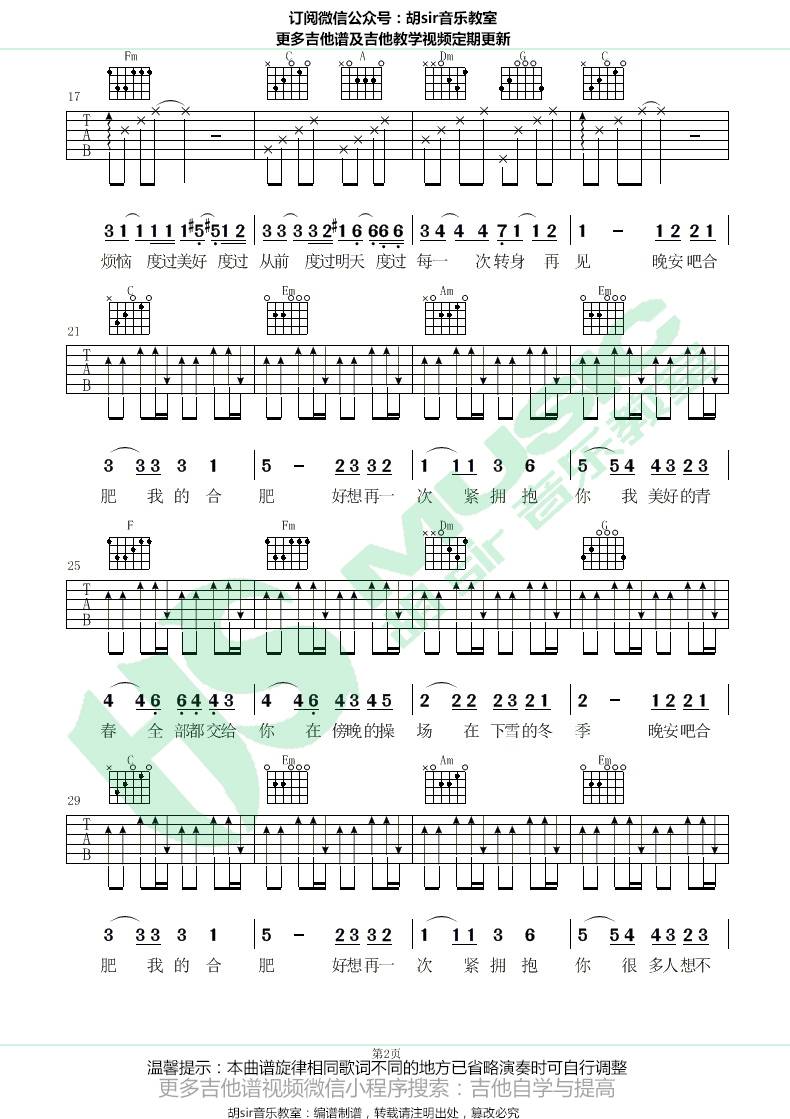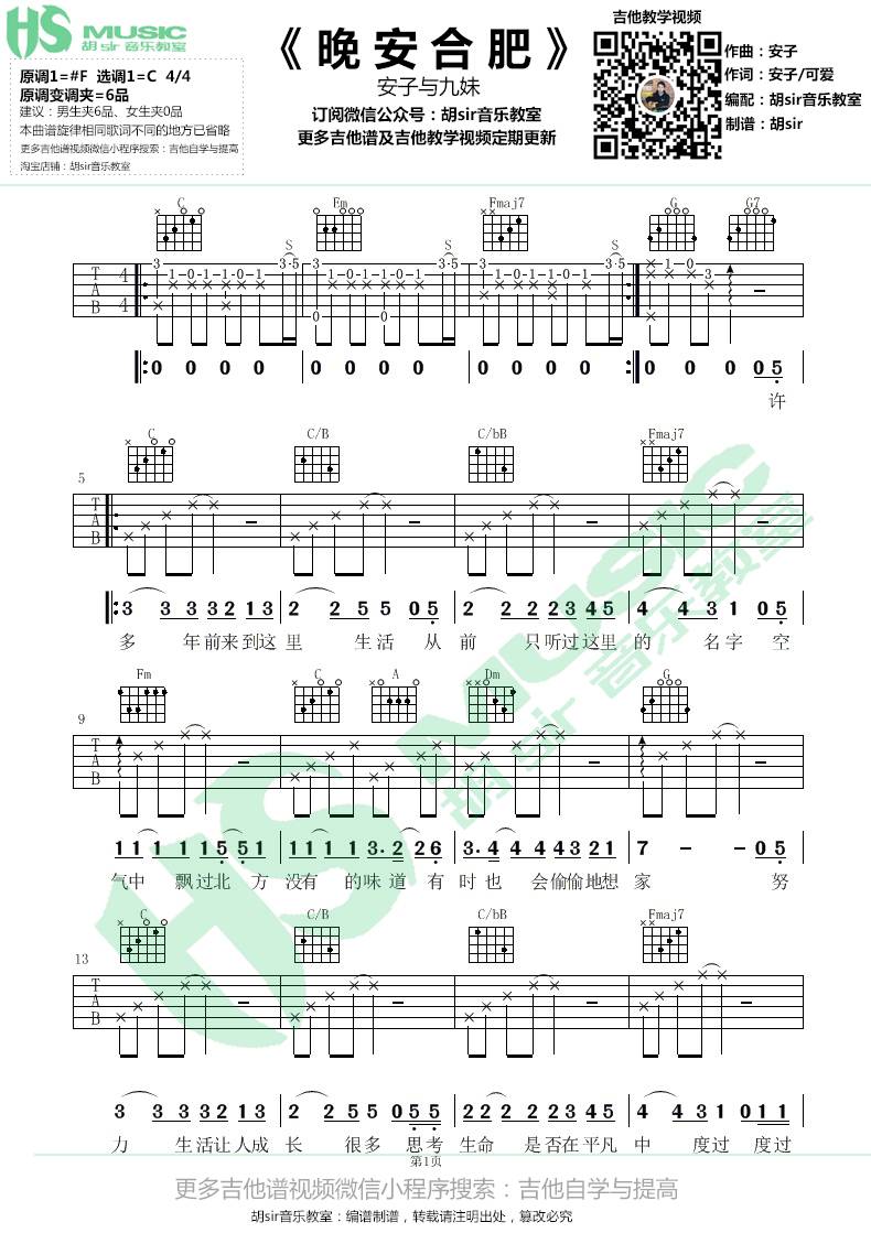曲谱介绍: 安子与九妹《晚安合肥》吉他弹唱谱,采用C调指法编配,共有3张高清图谱。