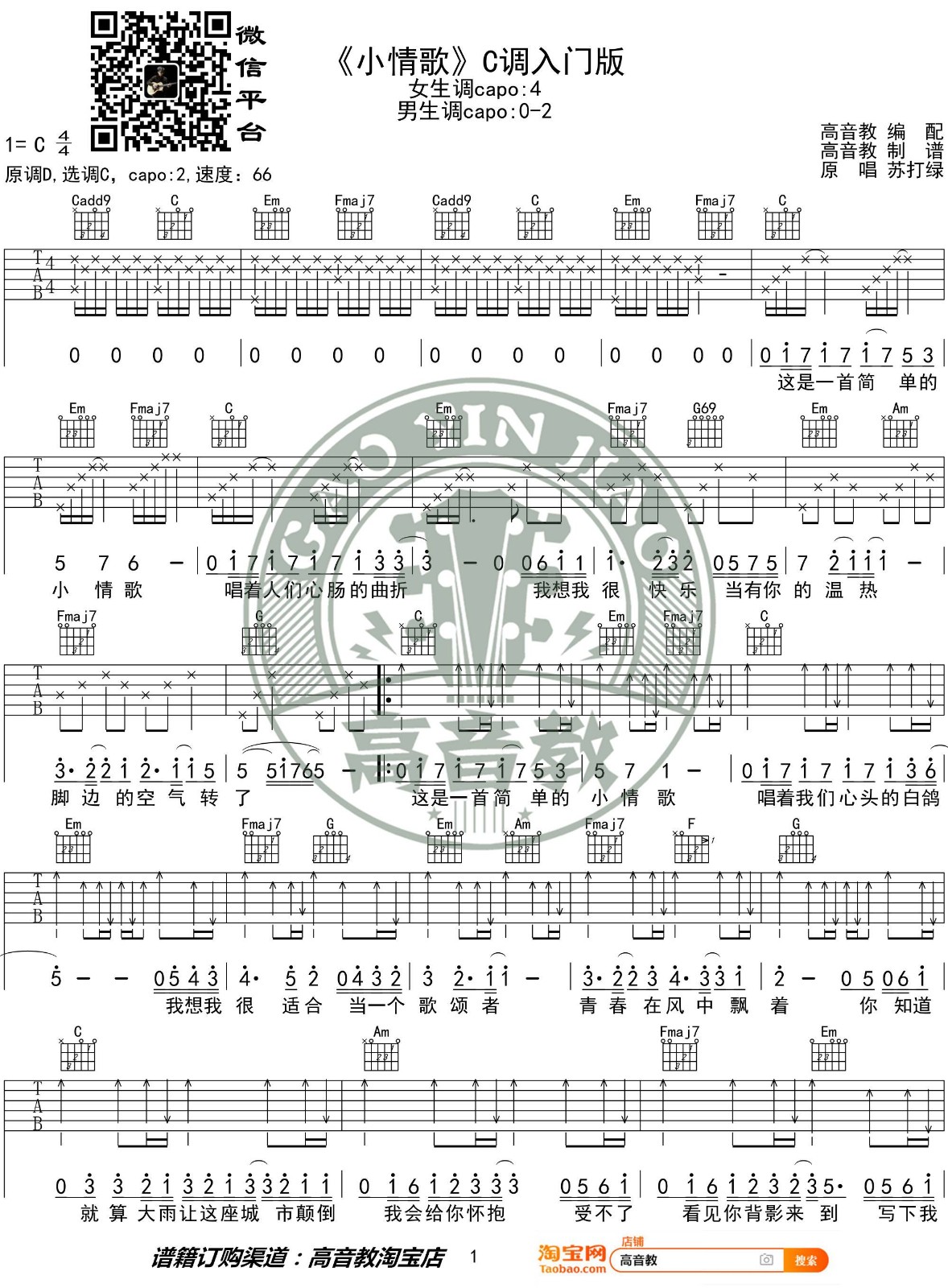 曲谱介绍: 苏打绿《小情歌》吉他弹唱谱,采用C调指法编配,高音教编配出品,共有2张高清图谱,免翻页排版设计。