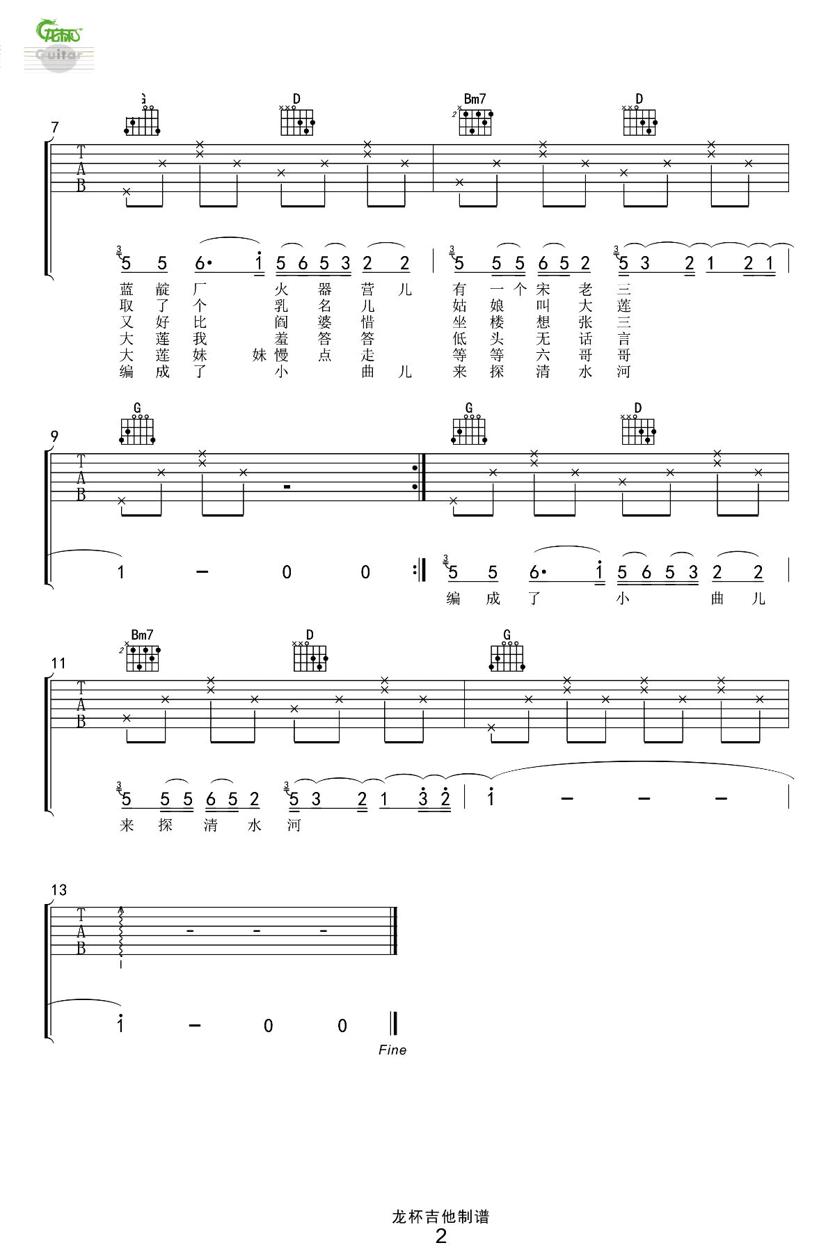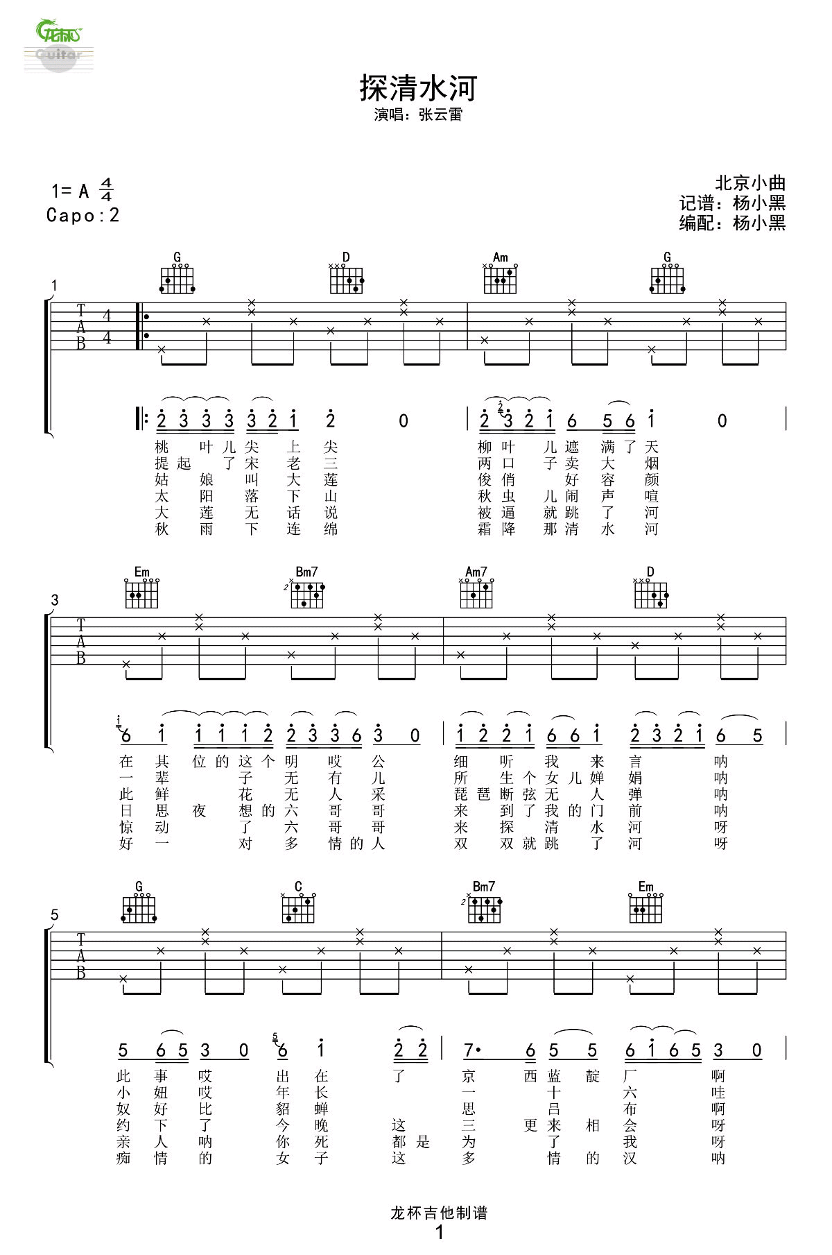 曲谱介绍: 《探清水河》吉他弹唱谱,采用A调指法编配,龙杯吉他编配出品,共有2张高清图谱,免翻页排版设计。