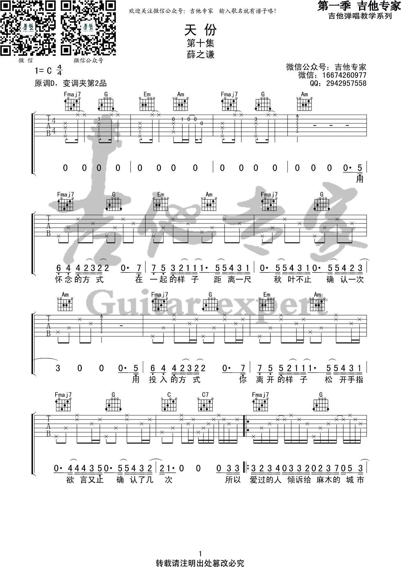 曲谱介绍: 薛之谦《天份》吉他弹唱谱,采用C调指法编配,音艺吉他编配出品,共有3张高清图谱。