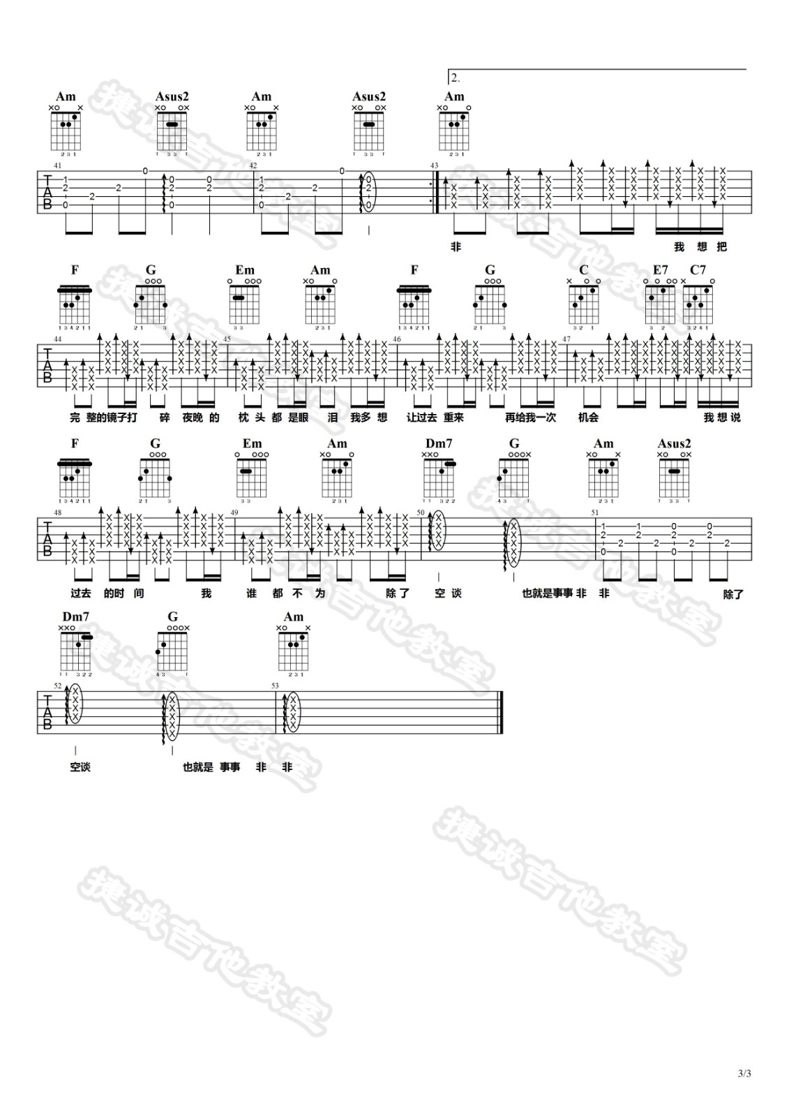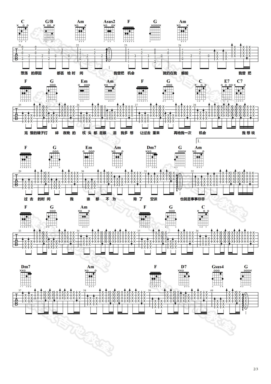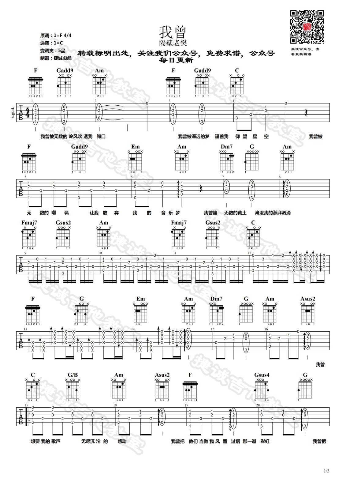 曲谱介绍: 隔壁老樊《我曾》吉他弹唱谱,采用C调指法编配,捷诚吉他教室编配出品,共有3张高清图谱。