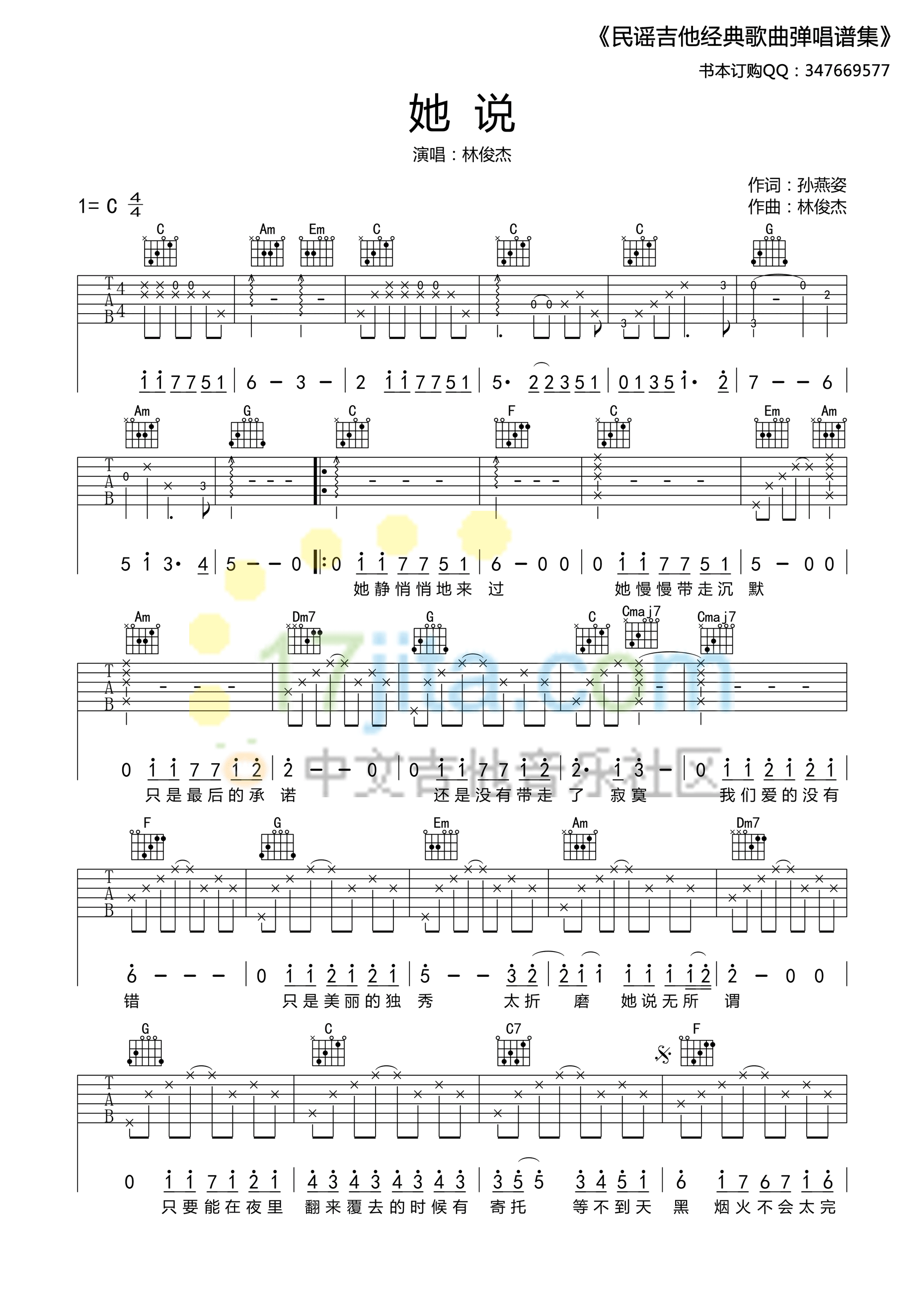 曲谱介绍: 林俊杰《她说》吉他弹唱谱,采用C调指法编配,17吉他编配出品,共有2张高清图谱,免翻页排版设计。